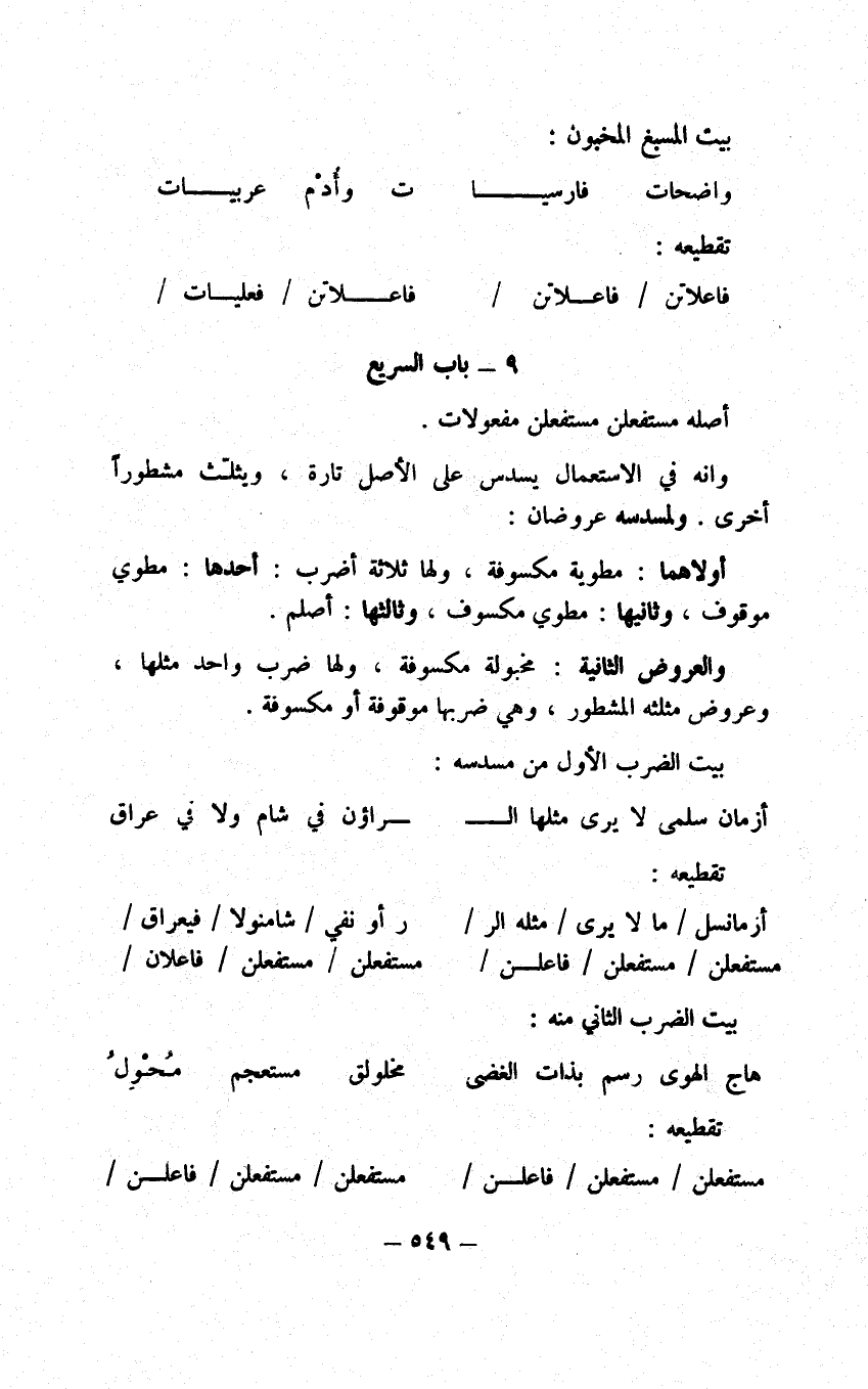 زحافه تجري في كل فاعلاتن ومس تفع لن الخبن والكف والشكل إلا فيما كان ضربا فالكف والشكل لا يجريان فيه ويجري في فاعلن الخبن وفي فاعلاتن الضربية التشعيث وكذا في العروضية لكن عند التصريع لا غير وبين نون فاعلاتن وسين مستفعلن وألف فاعلاتن أو فاعلن بعدها معاقبة، وكذا بين نون فاعلاتن وألف فاعلاتن المتصاحبتين، والأصحاب اختلفوا في كيفية وقوع التشعيث فمنهم من يسقط أول متحركي الوتد وبقدر المشعث فالاتن ثم ينقله على مفعولن ومسنده التشبيه بالخرم، ومنهم من يسقط ثاني متحركيه ذهابا على أنه أقرب على الآخر والآخر محل الحوادث ويقدر المشعث فاعاتن ثم ينقله، ومنهم من يسقط ساكن الوتد ويسكن ثاني متحركيه ويقدر المشعث فاعلتن بسكون اللام ثم ينقله ومسنده التشبيه بالقطع الواقع فيه أجزاء، ومنهم من يسقط الساكن قبله بالخبن ويسكن أول الوتد المشعث فعلاتن بسكون العين ثم ينقله، ولك أن تجعل مسنده التشبيه بالإضمار بعد أن تشبه فعلا من فعلاتن بالفاصلة، بيت المخبون: