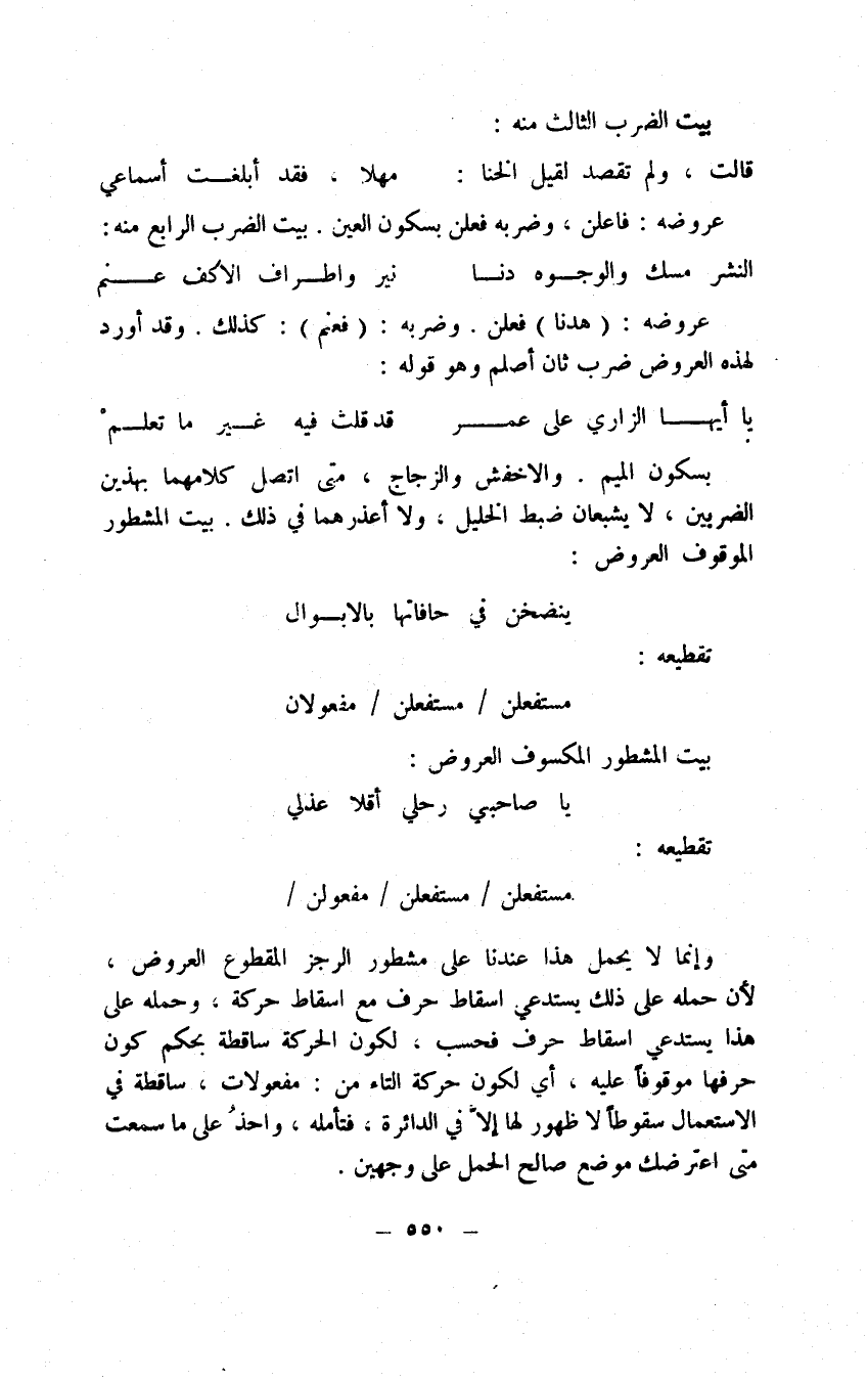 تقطيعه: مفاعيل فاعلاتن مرتين. زحافه يجري في فاعلاتن العروضي الكف كقوله: