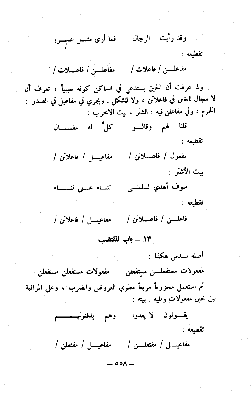 وأما تقديم ما يقدم من البحور في الدوائر فالطويل نظرا على أركان الأفاعيل المبدوء بها وأعني بالأركان الأسباب والأوتاد والفواصل يقدم على أخويه لكون ركنه الأول وهو فعو أتم من ركني أخويه وهما فاومس والهزج أيضا يقدم على أخويه لذلك، وأما الكامل فإنما يؤخر عن الوافر لأن صحة إضماره يبرزه في معرض ماركنه الأول سبب خفيف حكماً وصحة إجراء الخبن عليه منبه على ذلك، وكذا امتناعه عن الخرم امتناع ما أوله سبب خفيف على الرأي الصواب ولا يقف على هذا إلا النحوي المتقن حيث لا يبنى على السكون الضمير في غلامك أو التصريفي الماهر حيث لا يجوز الإلحاق بالألف في حشو الكلمة أو صاحب الطبع المستقيم في باب الاستدلال أو غيره ممن يفهم باب قولنا امتنع كذا لأدائه على الممتنع حكماً، وقولي على الرأي الصواب احتراز عن رأى من يجوز الخرم في مخبون مستفعلن مستشهدا بقوله: