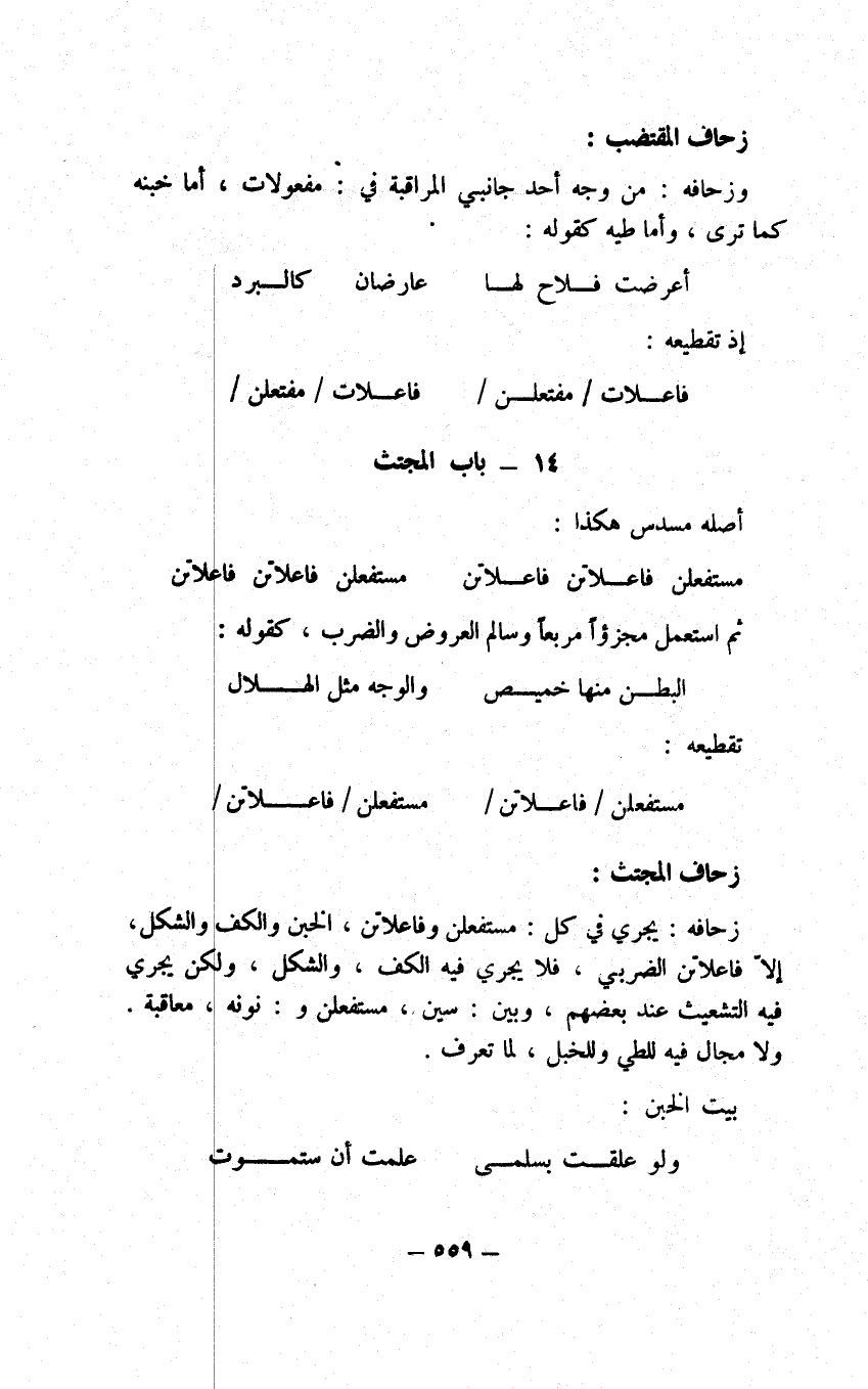 فصل وإذ قد وفينا بما كنا وعدنا فحري أن نختم الكلام في علم العروض بهذه الخاتمة، وهي ما أقوله من أن لك أن تتخذ الوافر أصلا وتفرع عليه جميع البحور على ما أذكره وهو أن تقدر أصل الوافر مثمنا منبها على ذلك بنحو قول امرئ القيس: