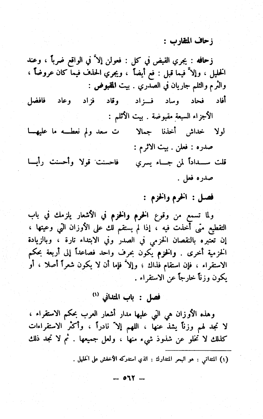 وعن بعضهم أن القافية هي البيت، وعن بعضهم هي القصيدة وحق هذا القول أن يكون من باب إطلاق اسم اللازم على الملزوم وباب تسمية المجموع بالبعض كقولهم: كلمة الحويذرة لقصيدته، وقول كل أحد كلمة الشهادة لمجموع أشهد أن لا إله إلا الله وأشهد أن محمدا رسول الله، وقوله علت كلمته " كبرت كلمة تخرج من أفواههم " والمراد بالكلمة مجموع كلامهم " اتخذ الله ولدا " وقوله " ولقد سبقت كلمتنا لعبادنا المرسلين " والمراد بالكلمة " إنهم لهم المنصورون وإن جندنا لهم الغالبون " وقوله " وكذلك حقت كلمة ربك على الذين كفروا " والمراد بالكلمة " أنهم أصحاب النار " وإلا لزم أن لا يصح قافية البيت أو قافية القصيدة لاستلزامه إضافة الشيء على نفسه وتسمى قافية لمكان التناسب وهو أنها تتبع نظم البيت مأخوذة من قفوت أثره إذا اتبعته والميل من هذه الأقوال إلى قوله على الخليل لوقوفه على أنواع علوم الأدب نقلا وتصرفا واستخراجا واختراعا ورعاية في جميع ذلك لما يجب رعايته أشد حد ما شق فيه أحد غباره. اللهم قدس روحه وارحم السلف كلهم واكسو الجميع حلل الرضوان، واجمعنا وإياهم في دار الثواب. وإذ قد اخترنا رأي الخليل في القافية وأنها على رأيه لابد من اشتمالها على ساكنين كما ترى فيستلزم لذلك خمسة أنواع: