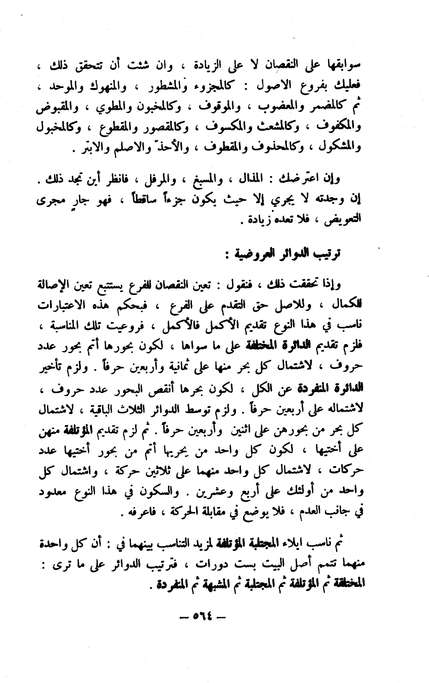 وللمتراكب ثمانية مفاعلتن ومفتعلن مطويا ومخذولا وفعلن للساكن قبله مخبونا لا غير ومخبونا محذوفاً وأحذ ومخبولا مكسوفا وفعل في نحو فعول فعل وللمتكاوس موقع واحد فعلتن للساكن قبله فهذه ثمانية وخمسون موقعا لأنواع القافية الخمسة وعساك إذا فتشت عنها أن تعثر على مزيد، ثم إن القافية لاشتمالها على حرف الروي تتنوع باعتبار الروي وباعتبار ما قبله وباعتبار ما بعده أما تنوعها باعتبار الروي فهي كونها إما مقيدة أو مطلقة، وأما تنوعها باعتبار ما قبل الروي فهي كونها إما مردفة أو مؤسسة أو مجردة، وأما تنوعها باعتبار ما بعد الروي ولا يلحقها هذا الاعتبار إلا في إطلاقها، فهي كونها إما موصولة من غير خروج أو مع خروج، والمراد بالروي الحرف الآخر من حروف القافية إلا ما كان تنوينا أو بدلا من التنوين أو كان حرفا إشباعيا مجلو بالبيان الحركة مثل المنزلا المنزلو المنزلي أو قائما مقام الإشباعي في كونه مجلوب البيان الحركة، وهو الهاء مثل كتابيه حسابيه أو مشابها للحرف
