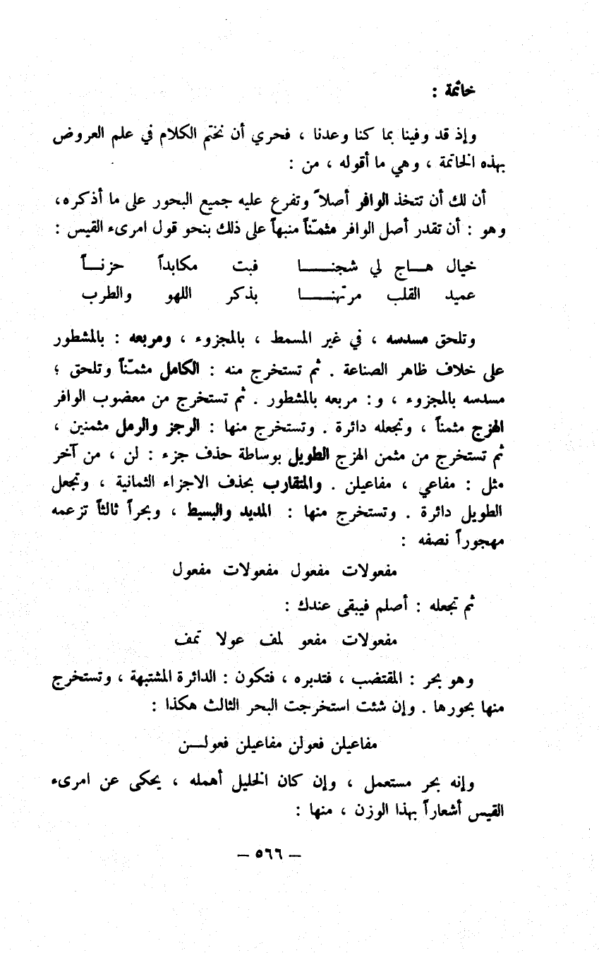والمراد بالقافية المؤسسة ما كان قبل رويها بحرف واحد ألف والروي وتلك الألف من كلمة واحدة مثل عامدا، أما إذا كانتا في كلمتين كنت بالخيار إن شئت ألحقت ذلك بالتأسيس، وإن شئت لم تلحقه اللهم إلا إذا نزلنا منزلة كلمة واحدة للوجوه المعلومة في ذلك في علم النحو فيكون الحكم للتأسيس، وتسمى هذه الألف التأسيس والفتحة قبلها رسا والحرف المتوسط بين هذه الألف وبين الروي تسمى هذه الألف وبين الروي تسمى الدخيل وحركته إشباعا، والمراد بالقافية المجردة ما لم يكن قبل رويها ردف ولا تأسيس، والمراد بالقافية الموصولة من غير خروج ما كان بعد رويها حرف واحد مما يسمى وصلا مثل منزلا منزلو منزله بالهاء الساكنة المتحرك ما قبلها، وبالقافية الموصولة مع الخروج ما كان بعد رويها هاء متحركة مع حرف إشباعي مثل منزلها منزلو منزلهي، وذلك الحرف يسمى خروجا، وحركة هاء الوصل نفاذا فهذه أنواع تسعة للقافية غير ما تقدمت. المجرد مثل منزل والمردف مثل عماد عمود عميد، ومثل قول قيل والمؤسس مثل عامد ثلاثيها مع التقييد وهو أن لا تجري الأواخر، ثم هذه الثلاثة مع الوصل بلا خروج، وذلك بأن تجري الأواخر بأن تحركها ملحقا إما ألفا أو واوا أو ياء مدتين أو هاء ساكنة مثل منزلا منزلو منزلي منزله منزله منزله في المجرد ومثل عمادا عمادو عمادي عماده في المردف، وعلى هذا أخواته في الردف كالعمود والعميد وكالقول والقيل، ومثل عامدا عامدو عامدي عامده في المؤسس، ثم هذه الثلاثة موصولة مع الخروج مثل منزلها منزلهو منزلهي في المجرد وعمادها، وكذلك الأخوات عمودها عميدها قولها قيلها وعمادهو