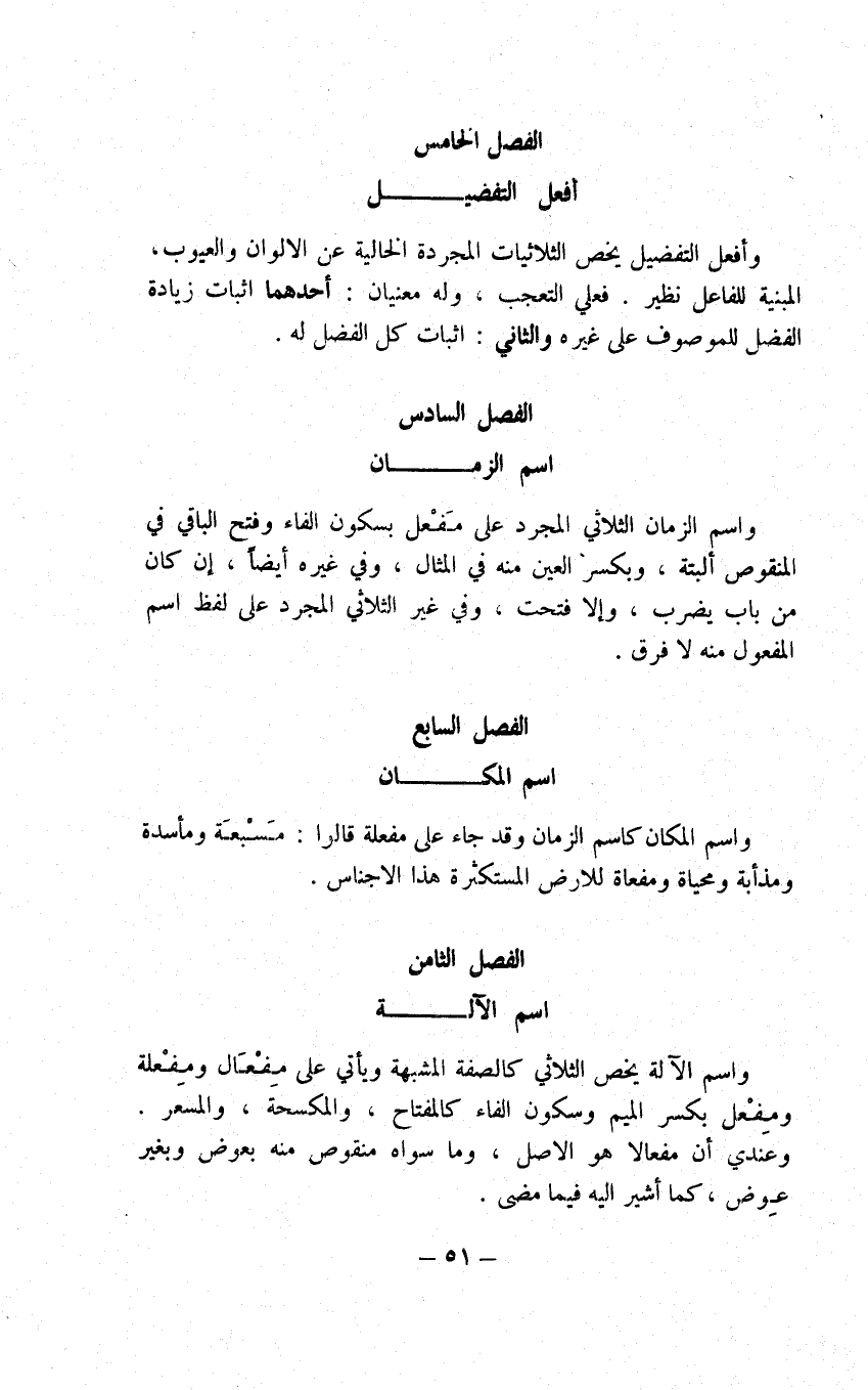 والقسم السابع ضرب واحد أيضاً: فعل أفعل فعال فعول فعلة أفعال أفعلة فعائل فعلان فعلان أفعلاء للثلاثي فيه زيادة ثالثة مدة وهو اسم نحو كثبب وأذرع وتختص بالمؤنث وأمكن شاذ وفصال وعنوق وغلمة وأيمان وأرغفة وأفائل وغزلان وقضبان وأنصباء قي كثيب وذراع وفصيل وعناق وغلام ويمين ورغيف وأفيل وغزال وقضيب ونصيب هذا ما سمعت فإذا نقل إليك تكسير على خلاف ضبطنا هذا فعلى أنه متروك المفرد أو أنه محمول على غيره لجهة كمرضى وهلكى وموتى وجربى وحمقى وكأيامى ويتامى. واعلم أن أفعل وأفعالا وأفعلة وفعلة من أوزان التكسير للقلة كالعشرة فما دونها.