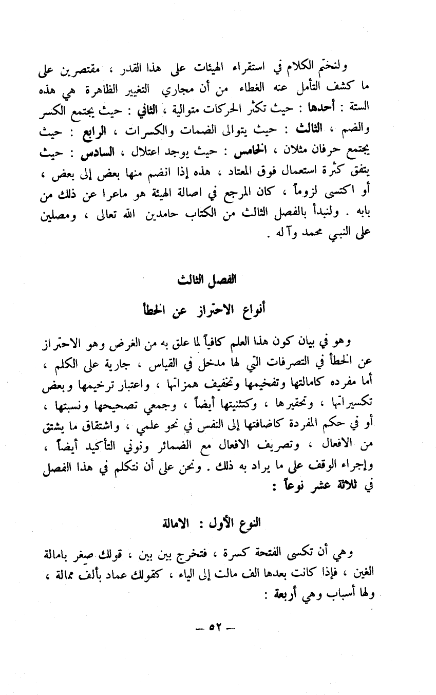 جريح ودمى وكذا منيذ وسؤيل وأخيذ وكذا بني ووعيدة في حر ودم وفي مذ وسل وخذ أسماء وفي ابن وعدة وثانيها مثال فعيلل بكسر ما بعد ياء التحقير فيما هو على أربعة أحرف كيف كانت نحو جعفر ومصحف وسلم وخدب تقول جعيفر ومصيحف وسليلم وخديب بالجمع بين الساكنين ياء التحقير والمدغم ولا يجمع بينهما في الوصل إلا في نحو ما ذكرنا وكذا إذا كان بدل ياء التحقير مدة كدابة، ويسمى هذا حد اجتماع الساكنين أو على أكثر بحرف أو حرفين فصاعدا فيرد على الأربعة بالحذف لما نيف عليها وتحقير مثل هذا مستكره: أي لا يقع في الاستعمال إلا نادرا ولا يحذف أصل مع وجود زائد ولا زائد مفيد مع وجود غير مفيد ولا غير مفيد له نظير مع وجود عديم النظير ولا غير آخر من الأصول مع وجود آخر اللهم إلا بجهة مناسبة بين ذاك وبين ما يليق به الحذف تقول دحيرج في مدحرج أو متدحرج بحذف الزائد دون أصل ومطيلق ومخيرج في منطلق ومستخرج بحذف ما سوى الميم لكون الميم علامة في اسم الفاعل وتقيريض في استقراض بحذف السين لوجود تفيعيل كتجيفيف دون سفيعيل وفريزد بحذف الآخر ولك ان تحذف الدال لمناسبتها التاء. وثالثها مثال فعيليل بإشباع كسرة ما بعد ياء التحقير فيما كان على خمسة أحرف. رابعها مدة كقريطيس وقنيديل وعصيفير وفيما يستكره تحقيره أيضا عوضا مما يحذف فكثيراً ما يقال فريزيد ومطيليق فقس والألف في المحقر ثانية لضرورة التحريك ترد على أصل إن وجد لها، وذلك إذا كانت غير زائدة وإلا قلبت واوا لضمة الصدر، وثالثة طرفا وغير طرف لامتناع بقائها ألفا لوقوع ياء التحقير الساكنة قبلها لا تظهر إلا ياء وههنا اعتبارات لطيفة فتأملها فقد عرفناك الأصول. ورابعة طرفا لغير التأنيث تقلب ياء والمقتضى لزوم كسر ما بعد ياء التحقير وللتأنيث مقصورة كانت أو