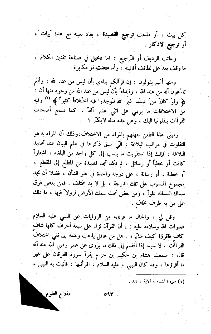 ونظيره ألقوه على وجه أبي يأت بصيرا ومن بحر الرجز دانية عليه ظلالها وذللت قطوفها تذليلا وزنه مفتعلن مفاعلن مفاعلن مفاعلن مفاعلن مفعولن ومن بحر الرمل وجفان كالجواب وقدور راسيات ووزنه فعلاتن فاعلاتن فعلاتن فاعلاتن ونظيره " ووضعنا عنك وزرك الذي أنقض ظهرك " ومن بحر السريع قال فما خطبك يا سامري وزنه مفتعلن مفتعلن فاعلن ونظيره نقذف بالحق على الباطل ومنه أو كالذي مر على قرية، ومن بحر المنسرح " إنا خلقنا الإنسان من نطفة " وزنه مستفعلن مفعولات مستفعلن ومن بحر الخفيف أرأيت الذي يكذب بالدين فذلك الذي يدع اليتيم " وزنه فعلاتن مفاعلن فعلاتن فعلاتن مفاعلن فاعلاتن ومنه لا يكادون يفقهون حديثا، وكذا قال يا قوم هؤلاء بناتي