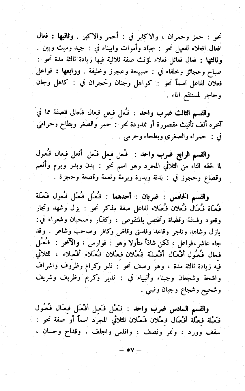 ذلك انقلاب الياء ألفا كان حكمها حكم الألف المقصورة في جميع ما تقدم إلا في تفاصيل كونها رابعة فلا يقع ههنا من تلك إلا الخيرة بين القلب والحذف وإن كان الحذف هو الأحسن وقالوا في نحو المحيي محوي تارة ومحيي أخرى وكذا لما التزم أيضا فتح العين في نحو طي ولية وحية قيل طووي ولووي وحيوي وفي نحو ظبية وقنية ودمية وكذا في بنات الواو لما التزمه يونس رحمه الله. قال ظبوي وقنوي ودموي، وكان الواو في غزوي عنده بدلا من الألف ولما يلتزم الخليل وسيبويه رحمهما الله فيها قالا ظبيى وغزوى في ظبية وغزوة كما في ظبى وغزو ويقول في نحو دو وكوة دوى وكوى، ومن ذلك أن تحذف ياء النسب إن كانت في الاسم فتقول في النسبة على نحو شافعي شافعي وكذا في كراسي أيضا رجل كراسي وكأن من قال مرمي في مرمي شبه الياء بياء النسبة، ومن قال مرموي ترك التشبيه، ومن ذلك أن تهمز في نحو حماية دون علاوة فتقول حمائي وعلاوي وتخير في نحو راية وثاية وآية بين الهمز والياء والواو ومما هو عن الضبط بمعزل حال الثنائي فقد رد في البعض كأخوي وأبوي وضعوي وستهي ولم يرد في بعض نحو عدي وزني وكذا الباب إلا ما اعتل لامه نحو شية فإنك تقول فيه وشوى وجاء الأمران في البعض نحو عدي وغدوي ودمي ودموي ويدي ويدوي وحري وحرحي وابني وبنوى وقالوا اسمي وسموي وكعدي وعدوي فقلبوا وأبو الحسن الأخفش رحمه الله تعالى: يعتبر الأصل فيما يرد فيقول وشيي وحرحي بالسكون وعلى هذا في أخواتهما والخليل وسيبويه رحمهما الله يقولان بنوى وأخوى في بنت وأخت ويونس رحمه الله يقول بنتي وأختي فلا ينظم تاءهما في سلك تاء التأنيث ومما هو أبعد عن الضبط قولهم بدوي وبصري وعلوي وطائي وسهلي ودهري وأموي وثقفي وقرشي وهذلي وخراشي وخرسي وخرفي وكذا عبدري وعبقسي وعبشمي فهذه وأمثالها على اللغة
