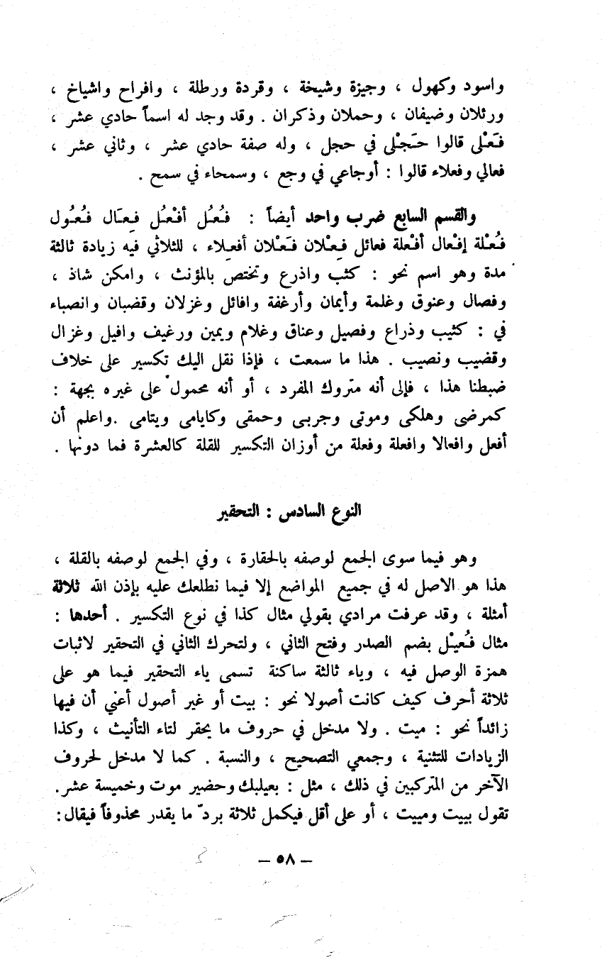 ويشترط في المنسوب أن يكون مفردا غير جمع ولا مركب ولا مضاف فيقال في النسبة على نحو صحائف وكتب صحفي وكتابي، وأما الأنصاري والأنباري والأعرابي فإنما ساغ ذلك لجريها مجرى القبائل كأنماري وضبابي وكلابى وكمعافري ومدايني وفي النسبة على نحو معدي كرب وخمسة عشر ونحو اثني عشر أيضا فتنبه معدي وخمسي واثني أو ثنوي وفي النسبة على نحو ابن الزبير وامرىء القيس زبيرى وامرئى