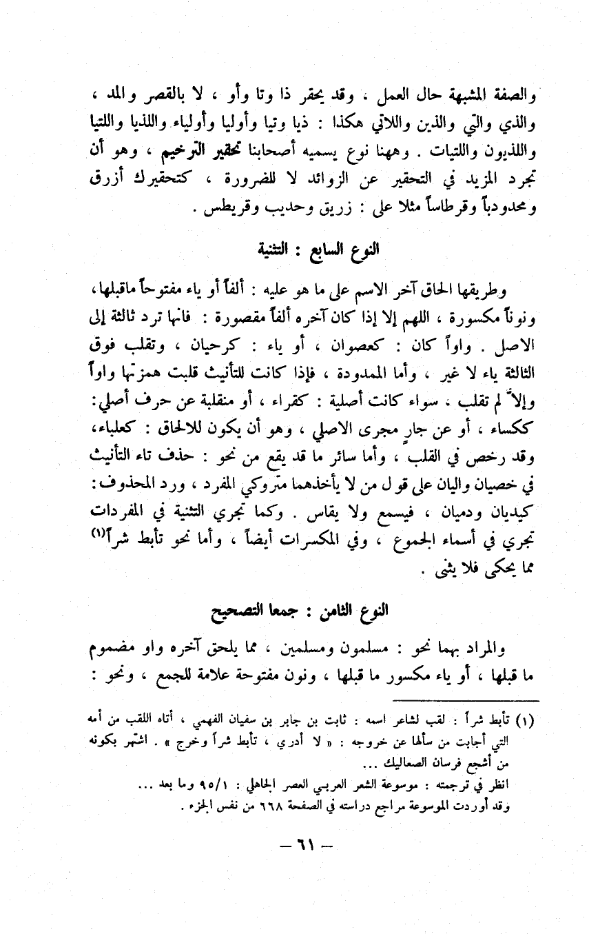الشرط يفوت في الماضي مع ثمانية من الضمائر وهي الضميران في الحكاية والخمسة في المواجهة وضمير جماعة النساء في غير المواجهة ولنسمها مسكنات الماضي فيزول الإدغام فيعود المدغم على حركته كقولك في باب فعل المفتوح العين كررت كررنا كررت كررتما كررتم كررت كررتن كررن، وفي باب فعل المكسور العين ظللت ظللنا وكذا في باب أفعل أعددت، وفي فاعل حاججت، وعلى هذا حتى إنك تقول احماررت واحمررت واقشعررت، وقد يحذف عند فك الإدغام أحد المتكررين كقولهم ظلت أو ظلت بفتح الظاء أو كسرها وكقوله أحسن به فهن إليه شموس ويزول الإعلال بالألف فيعود الأصل في الثلاثي المجرد كدعوت دعونا دعوت دعوتما دعوتم دعوت دعوتن دعون ورميت رمينا رميت رميتما رميتم رميت رميتن رمين، وفي غير الثلاثي المجرد يلزم الياء كأرضيت ورجيت وأما في الغابر فيفوت مع ضمير جماعة النساء في المواجهة وغير المواجهة فحسب ولنسمه مسكن الغابر فيزول الإدغام أيضا فيعود المدغم على حركته كقولك تعضضن ويعضضن وتقررن ويقررن وتشددن ويشددن وكذا في سائر الأبواب ويزول الإعلال بالألف ويلزم الياء هذا هو القياس كترضين ويرضين وتدعين ويدعين. وثانيهما في الحذف وهو أن من شرط ثبوت المدة ألفا كانت أو ياء أو واواً أن لا يقع بعدها ساكن غير مدغم، وهذا الشرط يفوت مع مسكنات الماضي في ماض قبل آخره مدة فتسقط المدة كقولك في قال قلت قلنا قلت قلتما قلتم قلت قلتن قلن، وفي اختار اخترت اخترنا وعلى هذا، وههنا أصل لابد من المحافظة عليه وهو أن ما قبل الألف عند سقوطها يفتح في غير الثلاثي