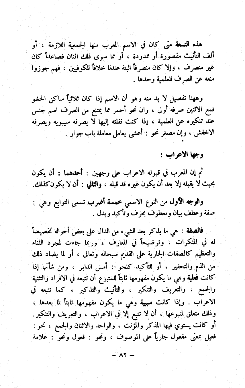 وبئس وساء في الذم جاريان في الاستعمال مجرى نعم. وأما النصب فلما يتصل به بعد الفاعل من غير التوابع له: أعني للفاعل وهو ثمانية أنواع: أحدها المفعول المطلق وهو ما يدل على مفهوم الفعل مجردا عن الزمان كنحو ضربت ضربا، ويسمى هذا مبهما وضربة وضربتين ويسمى هذا مؤقتا وضرب زيد والضرب الذي تعرف والذي ينوب منابه معنى ينتصب كنحو انتبه نباتا وقعدت جلوسا وضربت ثلاث ضربات وأنواعا من الضرب وسوطا ونحو عبد الله أظنه منطلق بمعنى أظن الظن وكما ينصبه الفعل وهو مظهر ينصبه وهو مضمر جرى فيه الإظهار كخير مقدم ومواعيد عرقوب وغضب الخيل على اللجم وأخوات لها أولم يجر كسقيا ورعيا وخيبة وجدعا وعقرا وبؤسا وبعدا وسحقا وحمدا وشكرا لا كفرا وغفرانك لا كفرانك وحنانيك ولبيك وسعديك ودواليك وحذاريك وهذاذيك سبحان الله ومعاذ الله وعمرك الله وقعدك الله ودفرا وبهرا وافة وتفة وويحك وويسك وويلك وويبك وأمثال لها. وثانيها هو المفعول له وهو علة الإقدام على الشيء مما يجتمع فيه أن يكون مصدرا وفعلا للمقدم ومقارنا للمقدم عليه كنحو أتيتك إكراما لك وتركت الشر مخافة كذا. والأصل فيه اللام فإذا لم يجتمع فيه ما ذكر التزم الأصل إلا في نحو زرتك أن تكرمني وأنك تحسن إلي. وثالثها المفعول فيه وهو الزمان الذي يوجد فيه الفعل مبهما أو مؤقتا نكرة أو معرفة كيف كان كنحو سرت يوما أو حينا أو الحين الطيب أو اليوم الذي تعرف أو المكان لكن مبهما فقط كنحو جلست مكانا أو خلفك أو يمينك، وأصل الباب في فمتى وقع الضمير