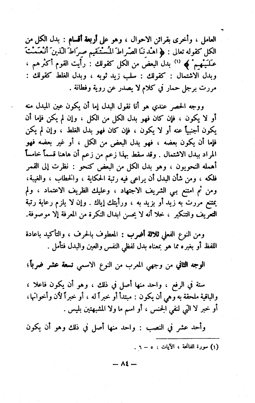 وأريت مجهولا وكذا أرى وترى وما ينخرط في هذا السلك يدخلن في باب ظننت، فيقال: أريت منطلقاً وأين ترى بشراً مقيماً وبنو سليم يجعلون باب قلت في الاستفهام مثل ظننت وثلاثة وذلك في نحو أعلمت وأريت كنحو أعلم الله عمراً فاضلاً وأريته إياه خير الناس معدتين بالهمزة، والأخفش يسلك بأخواتهما هذا المسلك وفي خمسة أفعال أجريت مجراهما، وهي: أنبأت ونبأت وأخبرت وخبرت وحدثت وكما ينتصب المفعول به عن العامل مظهراً ينتصب عنه مضمراً سواء لم يلزم إضماره كقولهم لرائي الرؤيا خيراً لنا وشراً لعدونا أو خيراً وما سر ولمن قطع حديثه حديثك بإضمار رأيت وهات وقولهم كاليوم رجلاً بإضمار لم أر وأخوات لها أو لزم كنحو قولهم: أهلا وسهلا وكليهما وتمرا وكل شيء ولا شتيمة حر وهذا ولا زعاماتك وأمراً ونفسه وأهلك والليل وشأنك والجمع ورأسك والحائط وعذيرك أو عاذرك، وفي باب التحذير إياك وعمراً والأسد الأسد وما شاكل ذلك، وفي باب الاختصاص إنا معشر العرب نفعل كذا ونحن آل فلان كرماء وبك الله نرجو الفضل. قال: