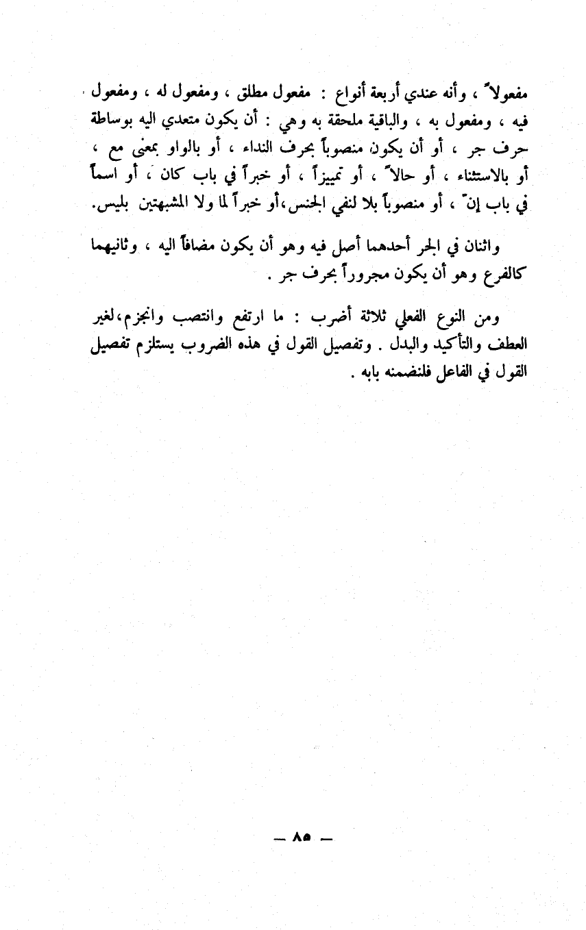 ضربت غلامه: أي أهنته أو أكرمت أخاه أي سررت، وعلى ذا فقس فيمن يترك المختار في هذه الأمثلة وهو الرفع بالابتداء لعدم الحاجة معه على الإضمار المحوج على التفسير أو نحو جزت القوم حتى جزته أو مررت به أو جزت غلامه أو نحو ضربته أو ما عمراً لقيته أو رجلا كلمته أو إذا تلقاه فأكرمه أو حيث تجده فعظمه أو نحو اضربه أو لا تضربه وإن شئت أما فاضربه أو فلا تضربه أو أمرّ الله عليه العيش وأما فجدعا له وأما عمراً فسقيا له أو نحو اللهم فارحمه فيمن يعمل بالمختار في هذه الأنواع. أما في الأول فلرعاية أن تناسب الجملة المعطوفة المعطوف عليها لعدم انقطاعها عنها، بخلاف ما لو قيل لقيت وأما عمرو فقد مررت به وإذا عمرو يكرمه فلان، فأما وإذا المفاجأة يقتطعان الكلام، وعلى الوجه كلام من حيث علم المعني لتفاوت الجملتين الفعلية والاسمية تجددا أو عدم تجدد فليتنبه. وأما في الثاني فلرعاية حق الاستفهام والنفي وكلمتي إذا وحيث لكون دخولها في الفعل أوقع. وأما في الثالث فللاحتراز عما لا تصح الجملة بعده، وهو الرفع بالابتداء غير محتملة للصدق والكذب، اللهم إلا بتأويل. وأما في الرابع فكمثل ذلك مع رعاية حق العاطف أو نحو أن تره تضربه أو هلا أو ألا أو لولا أو لوما ضربته فيمن يعمل بالواجب لامتناع هذه الحروف عن غير الأفعال. وخامسها الحال، وهي بيان كيفية وقوع الفعل كنحو جاء زيد راكباً وضربت اللص مكتوفا وجاء زيد والجيش قادم إذ معناه مقارنا بقدوم الجيش وزيد أبوك عطوفا وهو الحق بينا إذ أحق التقديرات يجيء عطوفا ويبدو بينا، ويظهر من هذا أن الأولى في نحو ضربت شديدا حمل المنصوب على الحال دون الوصف للمصدر والحال لا تكون إلا نكرة؛ فأما ذو الحال فلا يجوز تنكيره متقدما على الحال إلا إذا كان موصوفا ويجوز متأخرا ومن شأن الحال إذا كانت