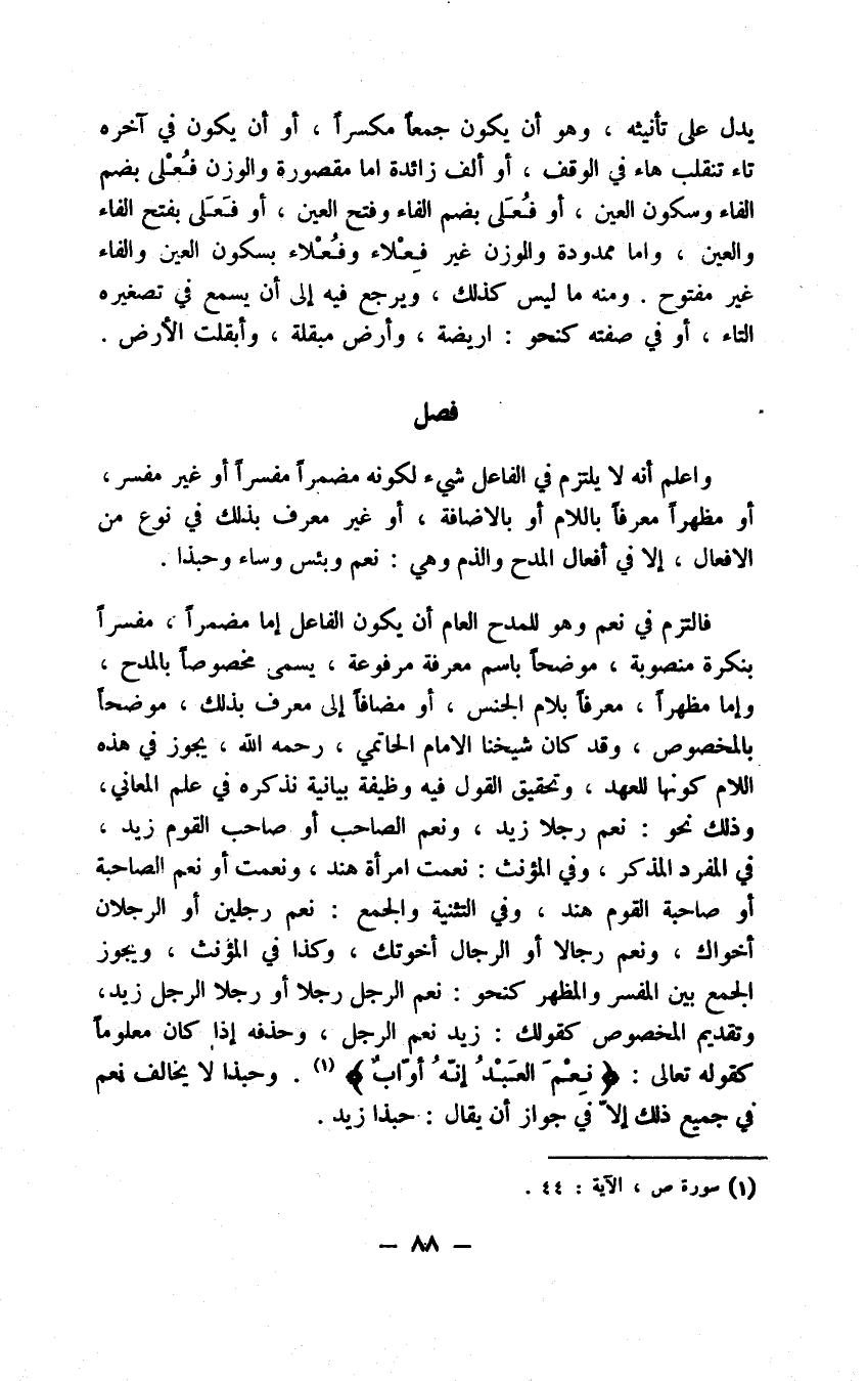 وفي الاستقبال أيضا برواية الإمام أبي الحسن محمد بن عبد الله بن الوراق رحمه الله، ومعنى ما بقي معنى صار وتقديم الخبر في هذا الباب على الاسم مطلقا جائز إلا في نحو كنته أو كنت إياه وهو المختار وعلى الأفعال التي ليست في أوائلها ما دون ليس ففيه خلاف جائز أيضا وواجب أيضا إذا كان فيه معنى استفهام كنحو متى كان القتال، وههنا أفعال تتصل بهذه النواقص، وتسمى أفعال المقاربة، وهي عسى وكاد وكرب وأوشك وجعل وأخذ وطفق واتصالها بها أنها مع المرفوع بدون الخبر لا تفيد وبينهما تفاوت فخبر عسى يأتي فعلا مضارعا مع أن وخبر كاد بدونها وتصريف عسى تارة يكون على نحو رمى فيقال عسيت عسينا على عسين وأخرى على نحو لعل فيقال عساني عسانا على عساهن وكثيراً ما يجعل أن مع الفعل المضارع فاعلها فتستغني إذ ذاك عن التصريف وتتم به كلاما وهما أعني عسى وكاد قد تتقارضان ثبوت أن ولا ثبوتها، وأوشك تجري مجرى عسى في استعمالها تارة ومجرى كاد أخرى، والباقية تجري مجرى كاد، ولما كان عسى لمقاربة الأمر على سبيل الرجاء، وكاد لمقاربته على سبيل الحصول لا جرم جعلنا ثبوت أن أصلا مع عسى ولا ثبوتها مع كاد. وثامنها المجرور بحرف الجر: مررت بزيد، وانتصابه لا يظهر إلا في تابعه كما يقال: