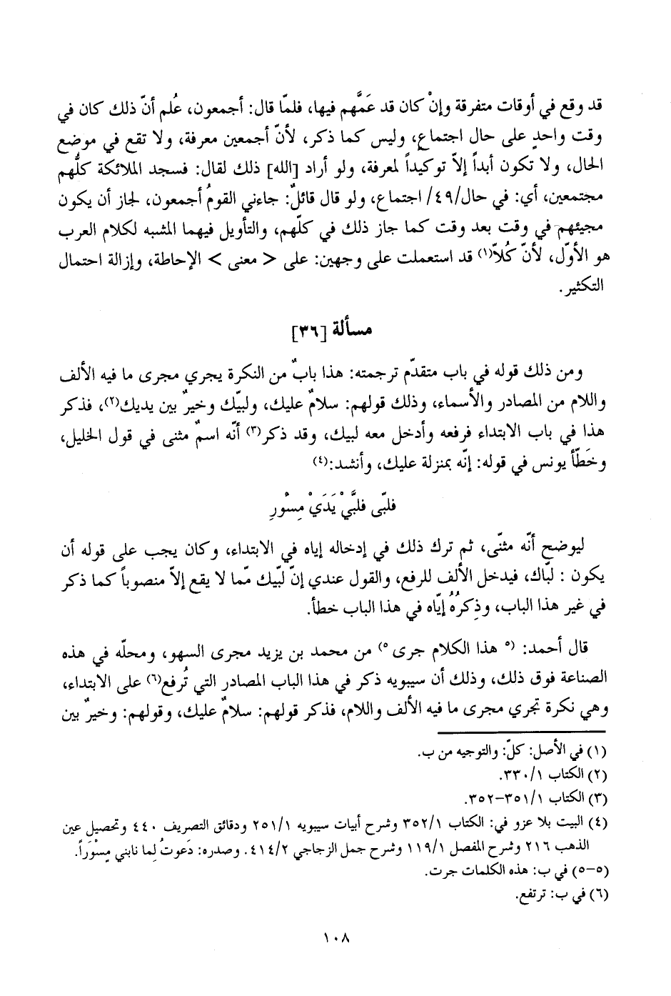 ومن ذلك قوله في باب متقدم ترجمته: هذا باب من النكرة يجري مجرى ما فيه الألف واللام من المصادر والأسماء، وذلك قولهم: سلام عليك، ولبيك وخير بين يديك، فذكر هذا في باب الابتداء فرفعه وأدخل معه لبيك، وقد ذكر أنه اسم مثنى في قول الخليل، وخطأ يونس في قوله: إنه بمنزلة عليك، وأنشد: