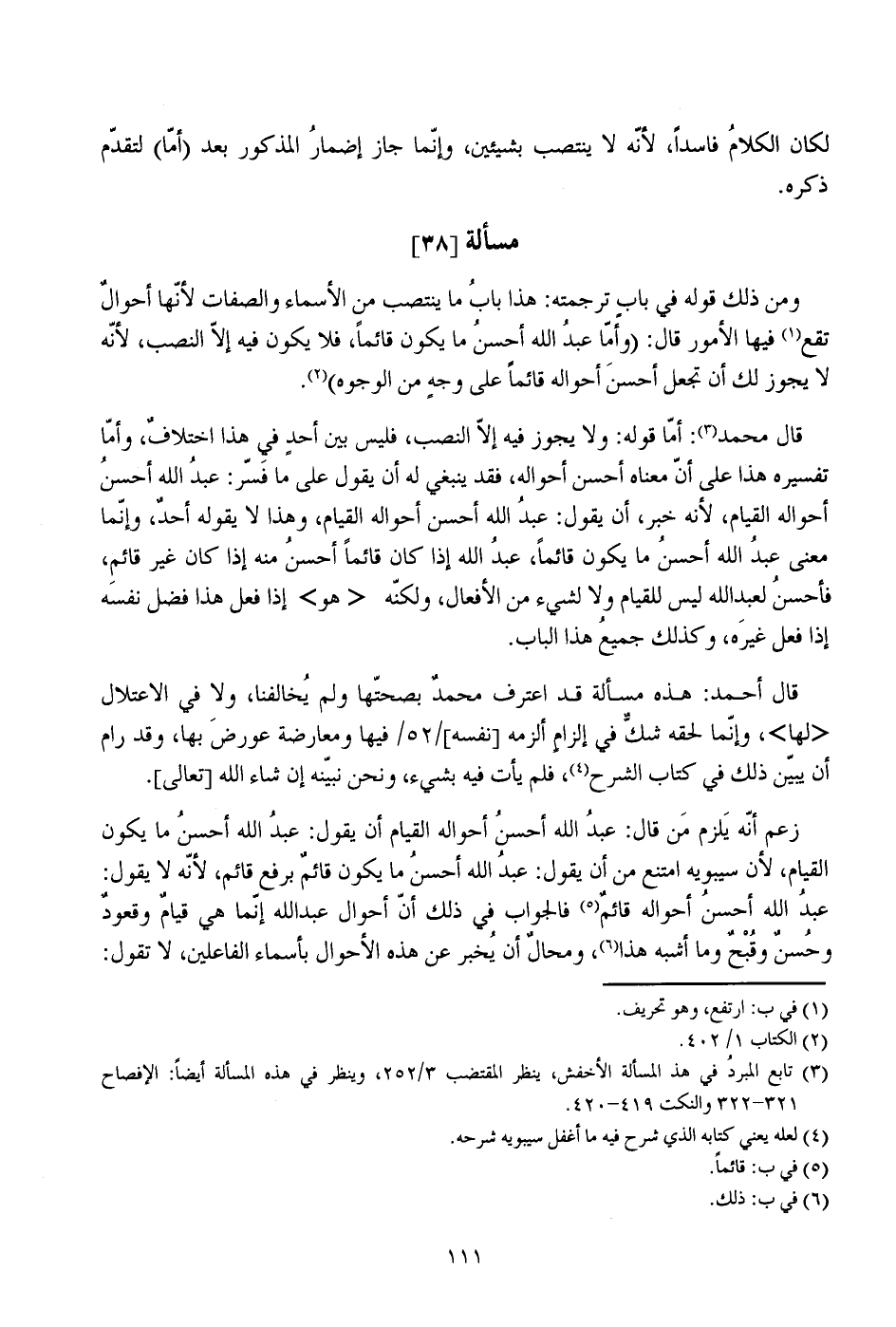 ومن ذلك قوله في باب ترجمته: هذا باب ما ينتصب من الأسماء والصفات لأنها أحوال تقع فيها الأمور قال: (وأما عبد الله أحسن ما يكون قائما، فلا يكون فيه إلا النصب، لأنه لا يجوز لك أن تجعل أحسن أحواله قائما على وجه من الوجوه).