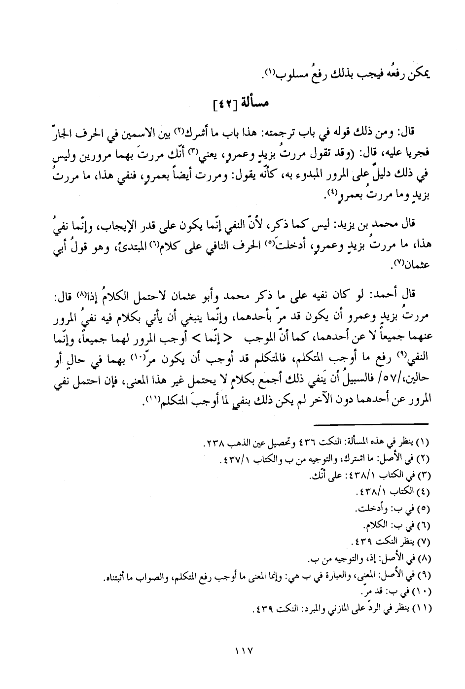 قال أحمد: لو كان نفيه على ما ذكر محمد وأبو عثمان لاحتمل الكلام إذا قال: مررت بزيد وعمرو أن يكون قد مر بأحدهما، وإنما ينبغي أن يأتي بكلام فيه نفي المرور عنهما جميعا لا عن أحداهما، كما أن الموجب "إنما" أوجب المرور لهما جميعا، وإنما النفي رفع ما أوجب المتكلم، فالمتكلم قد أوجب أن يكون مر بهما في حال أو حالين، /57/ فالسبيل أن ينفي ذلك أجمع بكلام لا يحتمل غير هذا المعنى، فإن احتمل نفي المرور عن أحدهما دون الآخر لم يكن ذلك بنفي لما أوجب المتكلم.