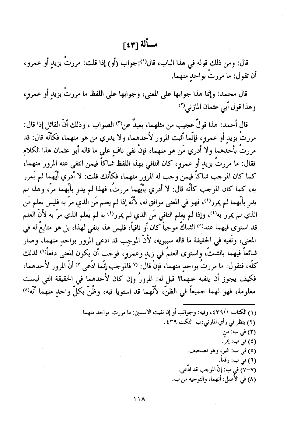قال أحمد: هذا قول عجيب من مثلهما، بعيد عن الصواب، وذلك أن القائل إذا قال: مررت بزيد أو عمرو، فإنما أثبت المرور لأحدهما، ولا يدري من هو منهما، فكأنه قال: قد مررت بأحدهما ولا أدري من هو منهما، فإن نفي ناف على ما قاله أبو عثمان هذا الكلام فقال: ما مررت بزيد أو عمرو، كان النافي بهذا اللفظ شاكا فيمن انتفى عنه المرور منهما، كما كان الموجب شاكا فيمن وجب له المرور منهما، فكأنك قلت: لا أدري أيهما لم يمرر به، كما كان الموجب كأنه قال: لا أدري بأيهما مررت، فهذا لم يدر بأيهما مر، وهذا لم يدر بأيهما لم يمرر، فهو في المعنى موافق له، لأنه إذا لم يعلم من الذي مر به فليس يعلم من الذي لم يمرر به، وإذا لم يعلم النافي من الذي لم يمرر به يعلم الذي مر به لأن العلم قد استوي فيهما عند الشاك موجبا كان أو نافيا، فليس هذا بنفي لهذا، بل هو متابع له في المعنى، ونفيه في الحقيقة ما قاله سيبويه، لأن الموجب قد ادعى المرور بواحد منهما، وصار شائعا فيهما بالشك، واستوي العلم في زيد وعمرو، فوجب أن يكون المعنى دفعا لذلك كله، فتقول: ما مررت بواحد منهما، فإن قال (فالموجب إنما ادعى أن المرور لأحدهما، فكيف يجوز أن ينفيه عنهما؟ قيل له: المرور وإن كان لأحدهما في الحقيقة التي ليست معلومة، فهو لهما جميعا في الظن، لأنهما قد استويا فيه، وظن بكل واحد منهما أنه