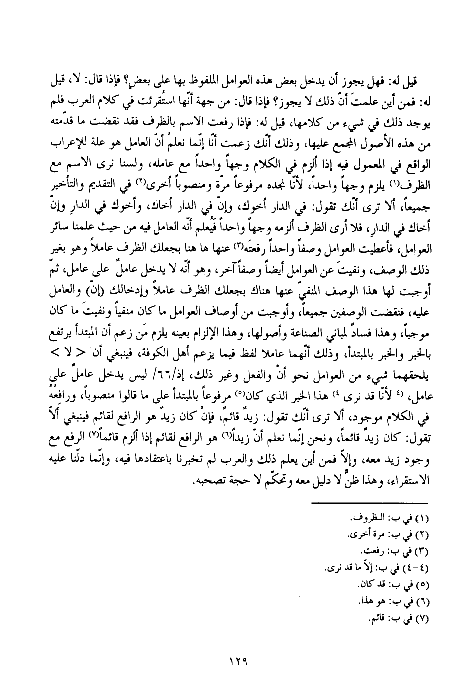 قيل له: فهل يجوز أن يدخل بعض هذه العوامل الملفوظ بها على بعض؟ فإذا قال: لا، قيل له: فمن أين علمت أن ذلك لا يجوز؟ فإذا قال: من جهة أنها استقرئت في كلام العرب فلم يوجد ذلك في شيء من كلامها، قيل له: فإذا رفعت الاسم بالظرف فقد نقضت ما قدمته من هذه الأصول المجتمع عليها، وذلك أنك زعمت أنا إنما نعلم أن العامل هو علة للإعراب الواقع في المعمول فيه إذا ألزم في الكلام وجها واحدا مع عامله، ولسنا نرى الاسم مع الظرف يلزم وجها واحدا، لأنا نجده مرفوعا مرة ومنصوبا أخرى في التقديم والتأخير جميعا، ألا ترى أنك تقول: في الدار أخوك، وإن في الدار أخاك، وأخوك في الدار وإن أخاك في لدار، فلا أرى الظرف ألزمه وجها واحدا فيعلم أنه العامل فيه من حيث علمنا سائر العوامل، فأعطيت العوامل وصفا واحدا رفعته عنها ها هنا بجعلك الظرف عاملا وهو بغير ذلك الوصف، ونفيت عن العوامل أيضا وصفا آخر، وهو أنه لا يدخل عامل على عامل، ثم أوجبت لها هذا الوصف المنفي عنها هناك بجعلك الظرف عاملا وإدخالك (إن) والعامل عليه، فنقضت الوصفين جميعا، وأوجبت من أوصاف العوامل ما كان منفيا ونفيت ما كان موجبا، وهذا فساد لمباني الصناعة وأصولها، وهذا الإلزام بعينه يلزم من زعم أن المبتدأ يرتفع بالخبر والخبر بالمبتدأ، وذلك أنهما عاملا لفظ فيما يزعم أهل الكوفة، فينبغي أن "لا" يلحقهما شيء من العوامل نحو أن والفعل وغير ذلك، إذ /66/ ليس يدخل عامل على عامل، (لأنا قد نرى) خذا الخبر الذي كان مرفوعا بالمبتدأ على ما قالوا منصوبا، ورافعه في الكلام موجود، ألا ترى أنك تقول: زيد قائم، فإن كان زيد هو الرافع لقائم فينبغي ألا تقول: كان زيد قائما، ونحن إنما نعلم أن زيدا هو الرافع لقائم إذا ألزم قائما الرفع مع وجود زيد معه، وإلا فمن أين يعلم ذلك والعرب لم تخبرنا باعتقادها فيه، وإنما دلنا عليه الاستقراء، وهذا ظن لا دليل معه وتحكم لا حجة تصحبه.