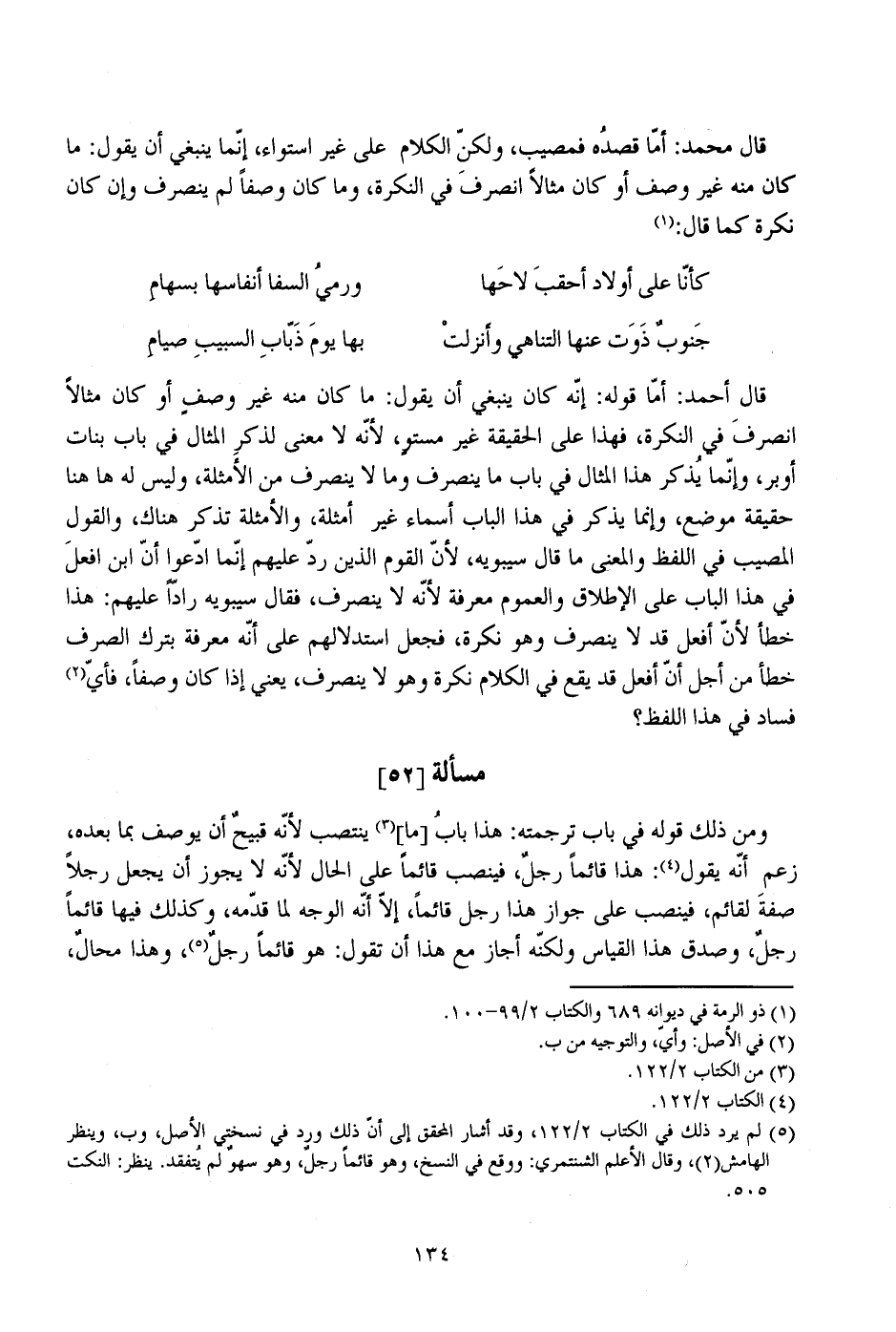 ومن ذلك قوله في باب ترجمته: هذا باب [ما] ينتصب لأنه قبيح أن يوصف بما بعده، زعم أنه يقول: هذا قائما رجل، فينصب قائما على الحال لأنه لا يجوز أن يجعل رجلا صفة لقائم، فينصب على جواز هذا رجل قائما، إلا أنه الوجه لما قدمه، وكذلك فيها قائما رجل، وصدق هذا القياس ولكنه أجاز مع هذا أن تقول: هو قائما رجل، وهذا محال،