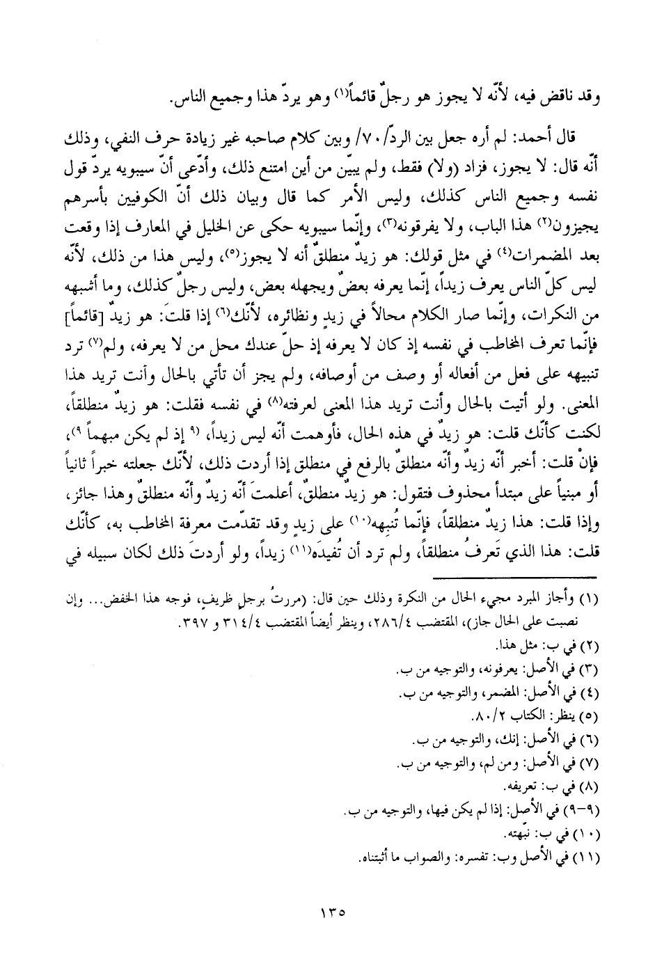 قال أحمد: لم أره جعل بين الرد /70/ وبين كلام صاحبه غير زيادة حرف النفي، وذل أنه قال: لا يجوز، فزاد (ولا) فقط، ولم يبين من أين امتنع ذلك، وأدعى أن سيبويه يرد قول نفسه وجميع الناس كذلك، وليس الأمر كما قال وبيان ذلك أن الكوفيين بأسرهم يجيزون هذا الباب، ولا يفرقونه، وإنما سيبويه حكى عن الخليل في المعارف إذا وقعت بعد المضمرات في مثل قولك: هو زيد منطلق أنه لا يجوز، وليس هذا من ذلك، لأنه ليس كل الناس يعرف زيدا، إنما يعرفه بعض ويجهله بعض، وليس رجل كذلك، وما أشبهه من النكرات، وإنما صار الكلام محالا في زيد ونظائره، لأنك إذا قلت هو زيد [قائما] فإنما تعرف المخاطب في نفسه إذا كان لا يعرفه إذا حل عندك محل من لا يعرفه، ولم ترد تنبيهه على فعل من أفعاله أو وصف من أوصافه، ولم يجز أن تأتي بالحال وأنت تريد هذا المعنى. ولو أتيت بالحال وأنت تريد هذا المعنى لعرفته في نفسه فقلت: هو زيد منطلقا، لكنت كأنك قلت: هو زيد في هذه الحال، فأوهمت أنه ليس زيدا، إذ لم يكن مبهما، فإذا قلت: أخبر أنه زيد وأنه منطلق بالرفع في منطلق إذا أردت ذلك، لأنك جعلته خبرا ثانيا أو مبنيا على مبتدأ محذوف فتقول: هو زيد منطلق، أعلمت أنه زيد وأنه منطلق وهذا جائز، وإذا قلت: هذا زيد منطلقا، فإنما تنبهه على زيد وقد تقدمت معرفة المخاطب به، كأنك قلت: هذا الذي تعرف منطلقا، ولم ترد أن تفيده زيدا، ولو أردت ذلك لكان سبيله في