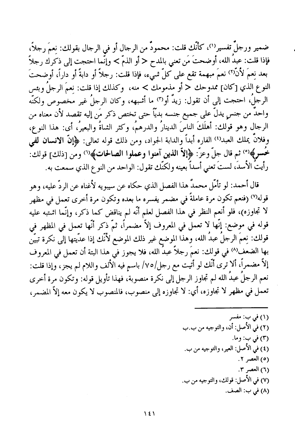 قال أحمد: لو تأمل محمد هذا الفصل الذي حكاه عن سيبويه لأغناه عن الرد عليه، وهو قوله (فنعم تكون مرة عاملة في مضمر يفسره ما بعده وتكون مرة أخرى تعمل في مظهر لا تجاوزه)، فلو أنعم النظر في هذا الفصل لعلم أنه لم يناقض كما ذكر، وإنما اشتبه عليه قوله في موضع: إنها لا تعمل في المعروف إلا مضمرا، ثم ذكر أنها تعمل في المظهر في قولك: نعم الرجل عبد الله، وهذا الموضع غير ذلك الموضع لأنك إذا عديتها إلى نكرة تبين بها الضعف في قولك: نعم رجلا عبد الله، فلا يجوز في هذا البتة أن تعمل في المعروف إلا مضمرا، ألا ترى أنك لو أتيت مع رجل /75/ باسم فيه الألف واللام لم يجز، وإذا قلت: نعم الرجل عبد الله لم تجاوز الرجل إلى نكرة منصوبة، فهذا تأويل قوله: وتكون مرة أخرى تعمل في مظهر لا تجاوزه، أي: لا تجاوزه إلى منصوب، فالمنصوب لا يكون معه إلا المضمر،