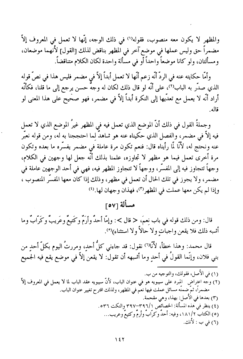 وأما حكايته عنه في الرد أنه زعم أنها لا تعمل أبدا إلا في مضمر فليس هذا في نص قوله الذي صدر به الباب، على أنه لو قال ذلك لكان له وجه حسن يرجع إلى ما قلنا، فكأنه أراد أنه لا يعمل مع تعديها إلى النكرة أبدا إلا في مضمر، فهو صحيح على هذا المعنى لو قاله.