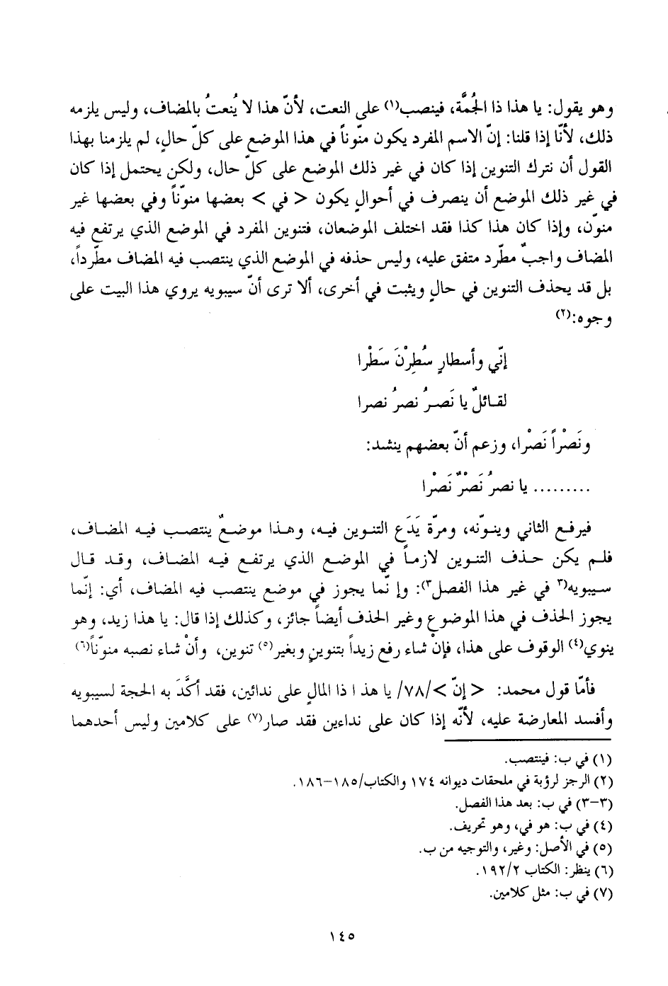 وهو يقول: يا هذا ذا الجمة، فينصب على النعت، لأن هذا لا ينعت بالمضاف، وليس يلزمه ذلك، لأنا إذا قلنا: إن الاسم المفرد يكون منونا في هذا الموضع على كل حال، لم يلزمنا بهذا القول أن نترك التنوين إذا كان في غير ذلك الموضع على كل حال، ولكن يحتمل إذا كان في غير ذلك الموضع أن ينصرف في أحوال يكون "في" بعضها منونا وفي بعضها غير منون، وإذا كان هذا كذا فقد اختلف الموضعان، فتنوين المفرد في الموضع الذي يرتفع فيه المضاف واجب مطرد متفق عليه، وليس حذفه في الموضع الذي ينتصب فيه المضاف مطردا، بل قد يحذف التنوين في حال ويثبت في أخرى، ألا ترى أن سيبويه يروي هذا البيت على وجوه: