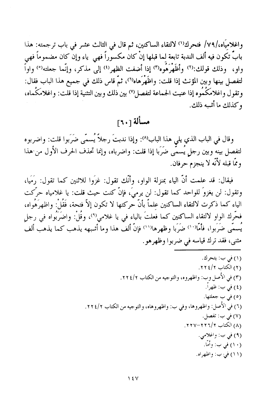 واغلامياه، /79/ فتحرك لالتقاء الساكنين، ثم قال في الثالث عشر في باب ترجمته: هذا باب تكون فيه ألف الندبة تابعة لما قبلها إن كان مكسورا فهي ياء وإن كان مضموما فهي واو، وذلك قولك: وأظهرهوه إذا أضفت الظهر إلى مذكر، وإنما جعلته واوا لتفصل بينها وبين المؤنث إذا قلت: واظهرهاه، ثم قاس ذلك في جميع هذا الباب فقال: وتقول واغلامكموه إذا عنيت الجماعة لتفصل بين ذلك وبين التثنية إذا قلت: واغلامكماه، وكذلك ما أشبه ذلك.