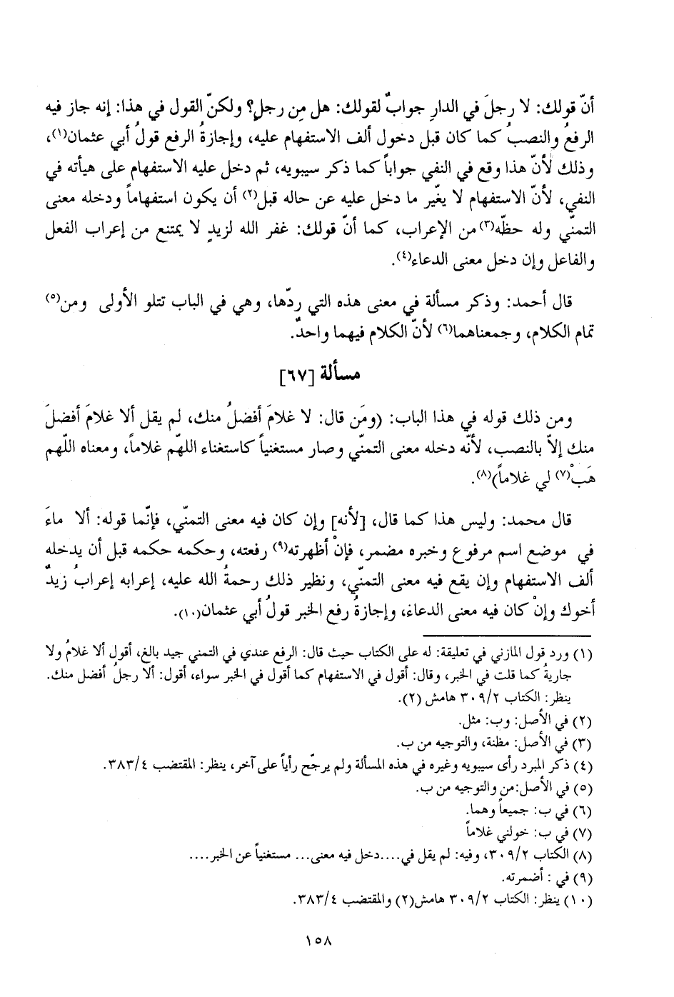 أن قولك: لا رجل في الدار جواب لقولك: هل من رجل؟ ولكن القول في هذا: إنه جاز فيه الرفع والنصب كما كان قبل دخول ألف الاستفهام عليه، وإجازة الرفع قول أبي عثمان، وذلك لأن هذا وقع في النفي جوابا كما ذكر سيبويه، ثم دخل عليه الاستفهام على هيأته في النفي، لأن الاستفهام لا يغير ما دخل عليه عن حاله قبل أن يكون استفهاما ودخله معنى التمني وله حظه من الإعراب، كما أن قولك: غفر الله لزيد لا يمتنع من إعراب الفعل والفاعل وإن دخل معنى الدعاء.