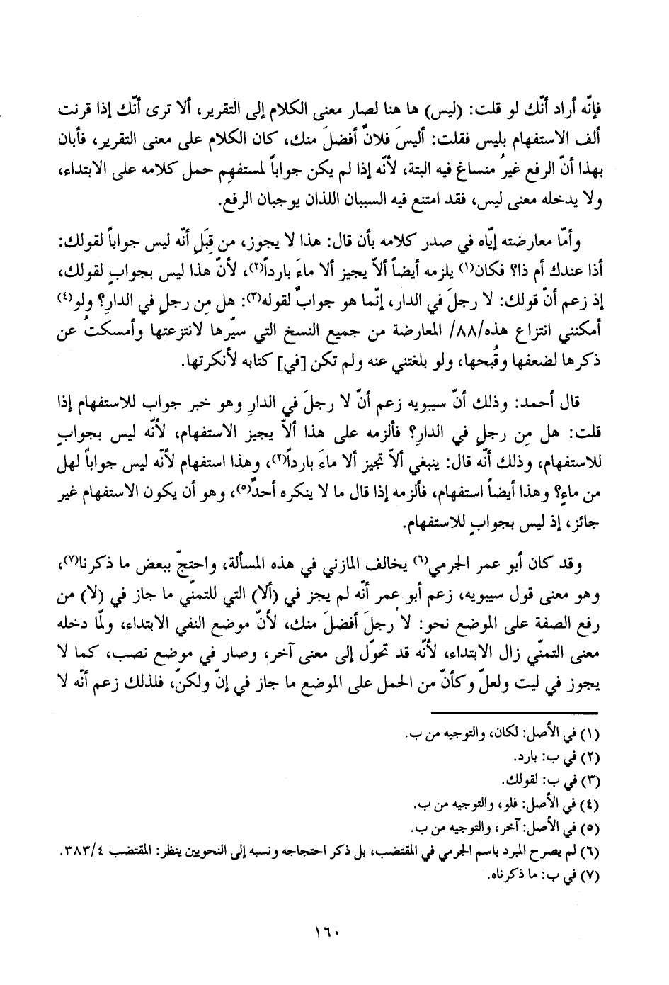 قال أحمد: وذلك أن سيبويه زعم أنه لا رجل في الدار وهو خبر جواب للاستفهام إذا قلت: هل من رجل في الدار؟ فألزمه على هذا ألا يجيز الاستفهام، لأنه ليس بجواب للاستفهام، وذلك أنه قال: ينبغي ألا تجيز ألا ماء باردا، وهذا استفهام لأنه ليس جوابا لهل من ماء؟ وهذا أيضا استفهام، فألزمه إذا قال ما لا ينكره أحد، وهو أن يكون الاستفهام غير جائز، إذ ليس بجواب للاستفهام.