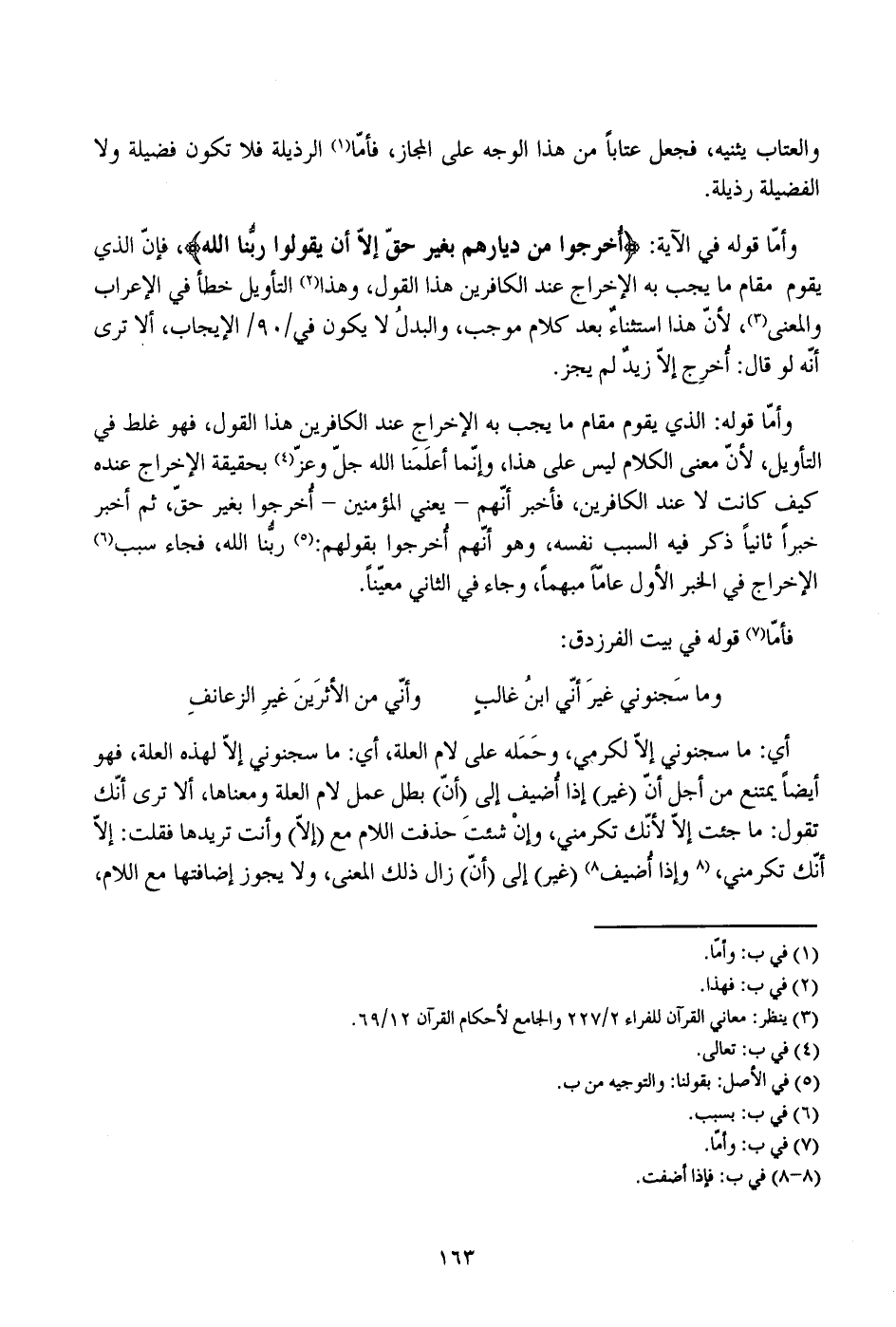 وأما قوله في الآية: {اخرجوا من ديارهم بغير حق إلا أن يقولوا ربنا الله}، فإن الذي يقوم مقام ما يجب به الإخراج عند الكافرين هذا القول، وهذا التأويل خطأ في الإعراب والمعنى، لأن هذا استثناء بعد كلام موجب، والبدل لا يكون في/ 90/ الإيجاب، ألا ترى أنه لو قال: أخرج إلا زيد لم يجز.