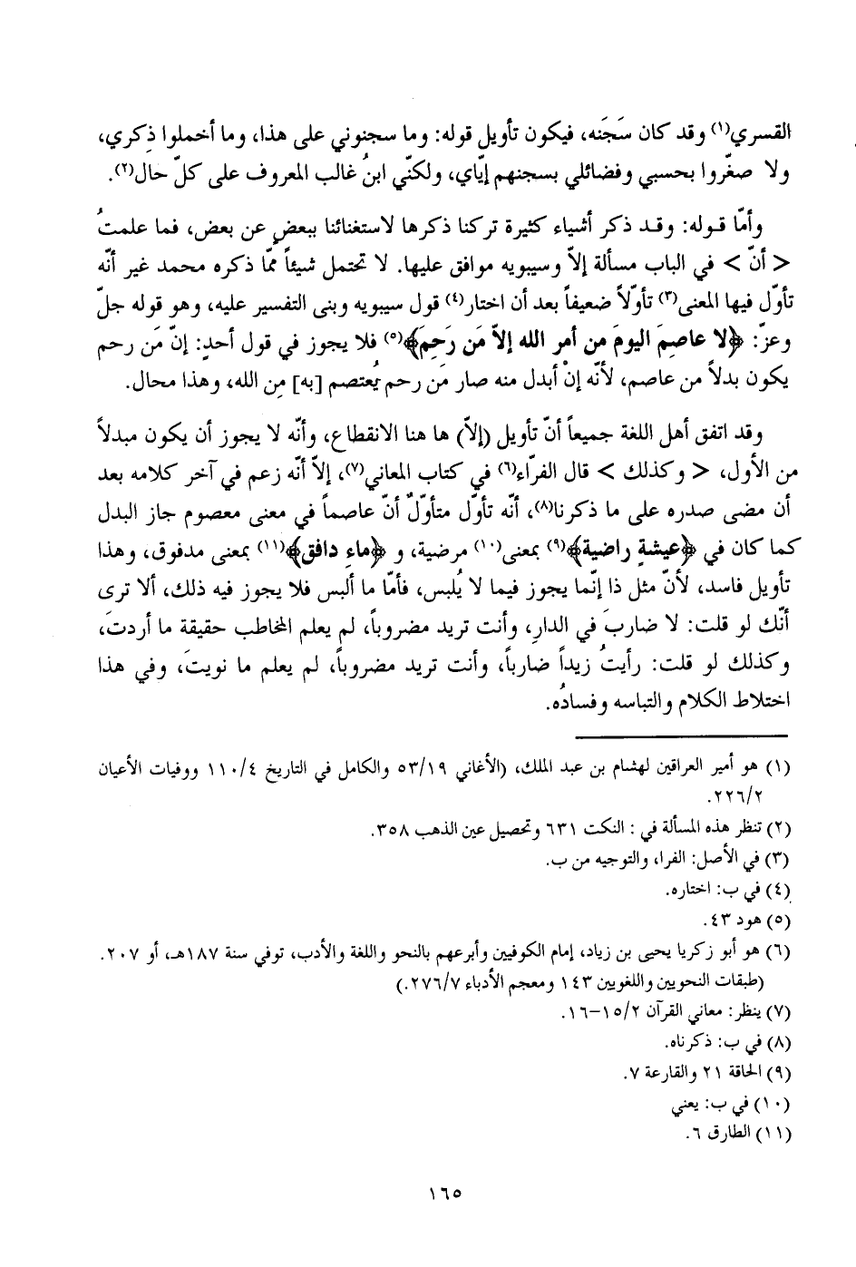 وقد اتفق أهل اللغة جميعا أن تأويل (إلا) هاهنا الانقطاع، وأنه لا يجوز أن يكون مبدلا من الأول، "وكذلك" قال الفراء في كتاب المعاني، إلا أنه زعم في آخر كلامه بعد أن مضى صدره على ما ذكرنا، أنه تأول متأول أن عاصما في معنى معصوم جاز البدل كما كان في {عيشة راضية} بمعنى مرضية، و {ماء دافق} بمعنى مدفوق، وهذا تأويل فاسد، لأن مثل ذا إنما يجوز فيما لا يلبس، فأما ما ألبس فلا يجوز فيه ذلك، ألا ترى أنك لو قلت: لا ضارب في الدار، وأنت تريد مضروبا، لم يعلم المخاطب حقيقة ما أردت، وكذلك لو قلت: رأيت زيدا ضاربا، وأنت تريد مضروبا، لم يعلم ما نويت، وفي هذا اختلاط الكلام والتباسه وفساده.