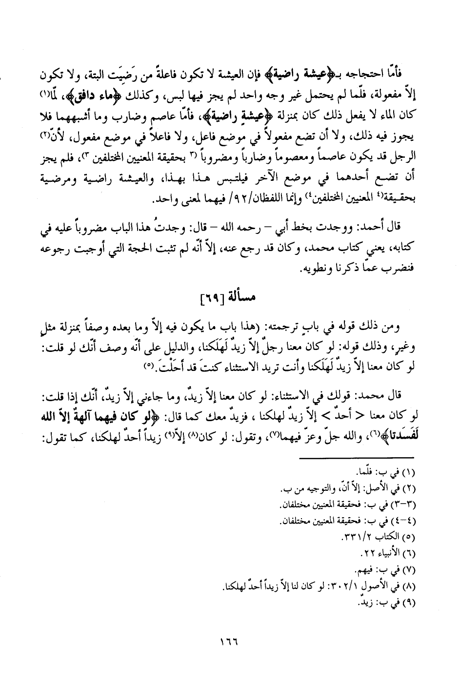 فأما احتجاجه بـ {عيشة راضية} فإن العيشة لا تكون فاعلة من رضيت البتة، ولا تكون إلا مفعولة، فلما لم يحتمل غير وجه واحد لم يجز فيها لبس، وكذلك {ماء دافق}، لما كان الماء لا يفعل ذلك كان بمنزلة {عيشة راضية}، فأما عاصم وضارب وما أشبههما فلا يجوز فيه ذلك، ولا أن تضع مفعولا في موضع فاعل، ولا فاعلا في موضع مفعول، لأن الرجل قد يكون عاصما ومعصوما وضاربا ومضروبا بحقيقة المعنيين المختلفين، فلم يجز أن تضع أحدهما في موضع الآخر فيلتبس هذا بهذا، والعيشة راضية ومرضية بحقيقة المعنيين المختلفين وإنما اللفظان/ 92/ فيهما لمعنى واحد.