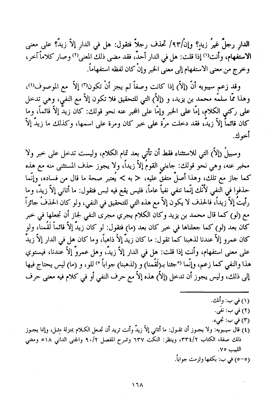 وسبيل (إلا) التي للاستثناء فقط أن تأتي بعد تمام الكلام، وليست تدخل على خبر ولا مخبر عنه، وهي نحو قولك: جاءني القوم إلا زيدا، ولا يجوز حذف المستثنى منه مع هذه كما جاز مع تلك، وهذا أصل متفق عليه، "به" يعتبر صحة ما قال من فساده، وإنما حذفوا في النفي لأنك إنما تنفي نفيا عاما، فليس يقع فيه لبس فتقول: ما أتاني إلا زيد، وما رأيت إلا زيدا، فالحذف لا يكون إلا مع هذه التي للتحقيق في النفي، ولو كان الحذف جائزا مع (لو) كما قال محمد بن يزيد وكان الكلام يجري مجرى النفي لجاز أن تجعلها في خبر كان بعد (لو) كما جعلناها في خبر كان بعد (ما) فتقول: لو كان زيد إلا قائما لقمنا، ولو كان عمرو إلا عندنا لذهبنا كما تقول: ما كان زيد إلا ذاهبا، وما كان هل في الدار إلا زيد على معنى استفهام، وأنت إذا قلت: هل في الدار إلا زيد، وهل عمرو إلا عندنا، فيستوي هذا والنفي كما زعم، وإنما جئنا بـ (لقمنا) و (لذهبنا) جوابا للو، و (ما) ليس يحتاج فيها إلى ذلك، وليس يجوز أن تدخل (إلا) هذه إلا مع حرف النفي أو في كلام فيه معنى حرف