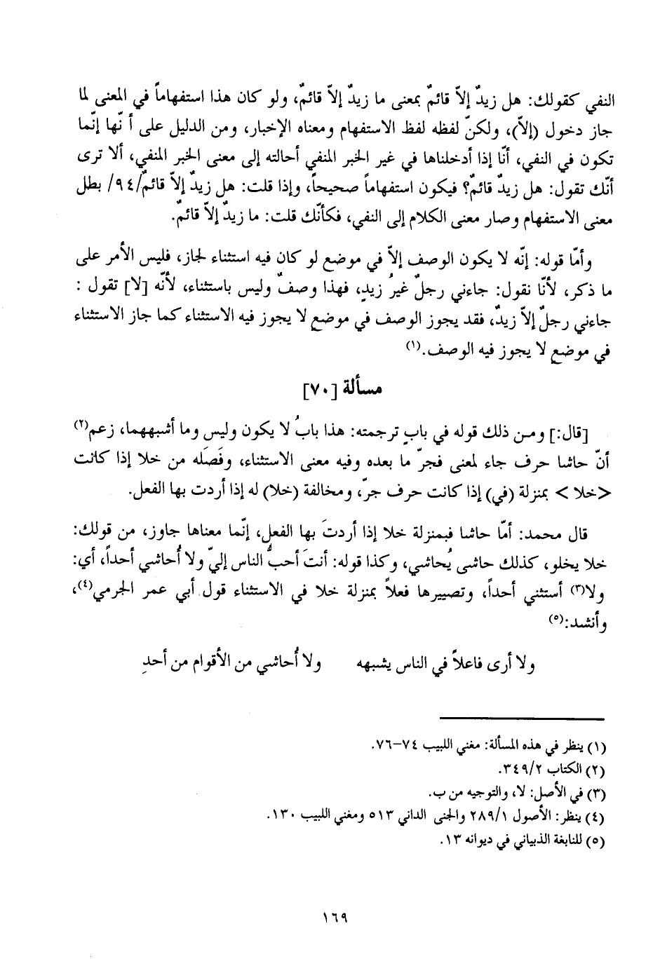 [قال: ] ومن ذلك قوله في باب ترجمته: هذا باب لا يكون وليس وما أشبههما، زعم أن حاشا حرف جاء لمعنى فجر ما بعده وفيه معنى الاستثناء، وفصله من خلا إذا كانت "خلا" بمنزلة (في) إذا كانت حرف جر، ومخالفة (خلا) له إذا أردت بها الفعل.
