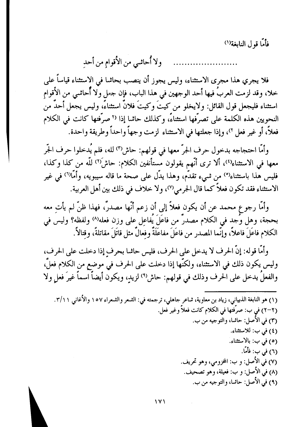 فلا يجري هذا مجرى الاستثناء، وليس يجوز أن ينصب بحاشا في الاستثناء قياسا على خلا، وقد لزمت العرب فيها أحد الوجهين في هذا الباب، فإن جعل ولا أحاشي من الأقوام استثناء فليجعل قول القائل: ولا يخلو من كيت وكيت فلان استثناء، وليس يجعل أحد من النحويين هذه الكلمة على تصرفها استثناء، وكذلك حاشا إذا صرفتها كانت في الكلام فعلا، أو غير فعل، وإذا جعلتها في الاستثناء لزمت وجها واحدا وطريقة واحدة.