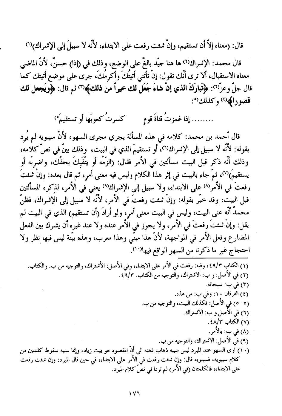 قال أحمد بن محمد: كلامه في هذه المسألة يجري مجرى السهو، لأن سيبويه لم يرد بقوله: لأنه لا سبيل إلى الإشراك، أو تستقيم الذي في البيت، وذلك بين في نص كلامه، وذلك أنه ذكر قبل البيت مسألتين في الأمر فقال: (الزمه أو يتقيك بحقك، واضربه أو يستقيم)، ثم جاء بالبيت في إثر هذا الكلام وليس فيه معنى أمر، ثم قال بعده: وإن شئت رفعت في الأمر على الابتداء، ولا سبيل إلى الاشتراك يعني في الأمر، لذكره المسألتين قبل البيت، وقد خبر بقوله: وإن شئت رفعت في الأمر، لأنه لا سبيل إلى الإشراك، فظن محمد أنه عني البيت، وليس في البيت معنى أمر، ولو أراد (أن تستقيم) الذي في البيت لم يقل: وإن شئت رفعت في الأمر، ولا يجوز في الأمر عنده ولا عند غيره أن يشرك بين الفعل المضارع وفعل الأمر في المواجهة، لأن هذا مبني وهذا معرب، وهذه بينة ليس فيها نظر ولا احتجاج غير ما ذكرنا من السهو الواقع فيها.
