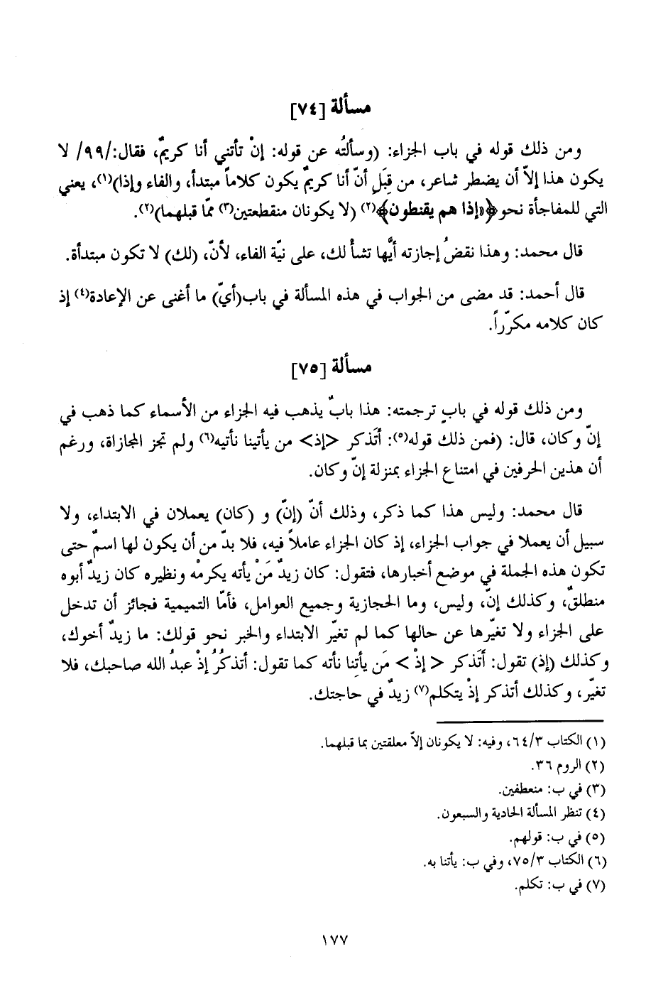 ومن ذلك قوله في باب الجزاء: (وسألته عن قوله: إن تأتني أنا كريم، فقال: /99/ لا يكون هذا إلا أن يضطر شاعر، من قبل أن أنا كريم يكون كلاما مبتدأ، والفاء وإذا)، يعني التي للمفاجأة نحو {إذا هم يقنطون} (لا يكونان منقطعتين مما قبلهما).