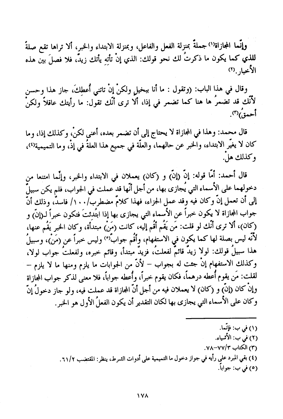 قال أحمد: أما قوله: إن (إن) و (كان) يعملان في الابتداء والخبر، وإنما امتنعا من دخولهما على الأسماء التي يجازى بها، من أجل أنها قد عملت في الجواب، فلم يكن سبيل إلى أن تعمل إن وكان فيه وقد عمل الجزاء، فهذا كلام مضطرب /100/ فاسد، وذلك أن جواب المجازاة لا يكون خبرا عن الأسماء التي يجازى بها إذا ابتدئت فتكون خبرا لـ (إن) و (كان)، ألا ترى أنك لو قلت: من يقم أقم إليه، كانت (من) مبتدأة، وكان الخبر يقم عنها، لأنه ليس بصلة لها كما يكون في الاستفهام، وأقم جواب وليس خبرا عن (من)، وسبيل هذا سبيل قولك: لولا زيد قائم لفعلت، فزيد مبتدأ، وقائم خبره، ولفعلت جواب لولا، وكذلك الاستفهام إن جئت له بجواب- لأن من الجوابات ما يلزم ومنها ما لا يلزم- لقلت: من يقوم أعطه درهما، فكان يقوم خبرا، وأعطه جوابا، فلا معنى لذكر جواب المجازاة وإن كان (إن) و (كان) لا يعملان فيه من أجل أن المجازاة قد عملت فيه، ولو جاز دخول إن وكان على الأسماء التي يجازى بها لكان التقدير أن يكون الفعل الأول هو الخبر.