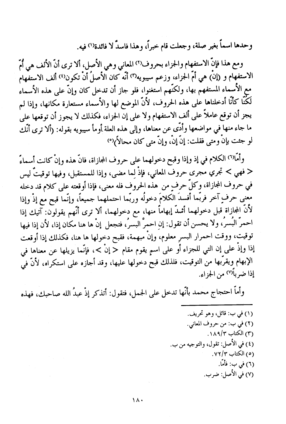 ومع هذا فإن الاستفهام والجزاء بحروف المعاني وهي الأصل، ألا ترى أن الألف هي أم الاستفهام و (إن) هي أم الجزاء، وزعم سيبويه أنه كان الأصل أن تكون ألف الاستفهام مع الأسماء المستفهم بها، ولكنهم استغنوا، فلو جاز أن تدخل كان وإن على هذه الأسماء لكنا كأنا أدخلناها على هذه الحروف، لأن الموضع لها والأسماء مستعارة مكانها، وإذا لم يجز أن توقع عاملا على ألف الاستفهام ولا على إن الجزاء، فكذلك لا يجوز أن توقعها على ما جاء منها في مواضعها وأدى عن معناها، وإلى هذه العلة أومأ سيبويه بقوله: (ألا ترى أنك لو جئت بإن ومتى فقلت: إن إن، وإن متى كان محالا).