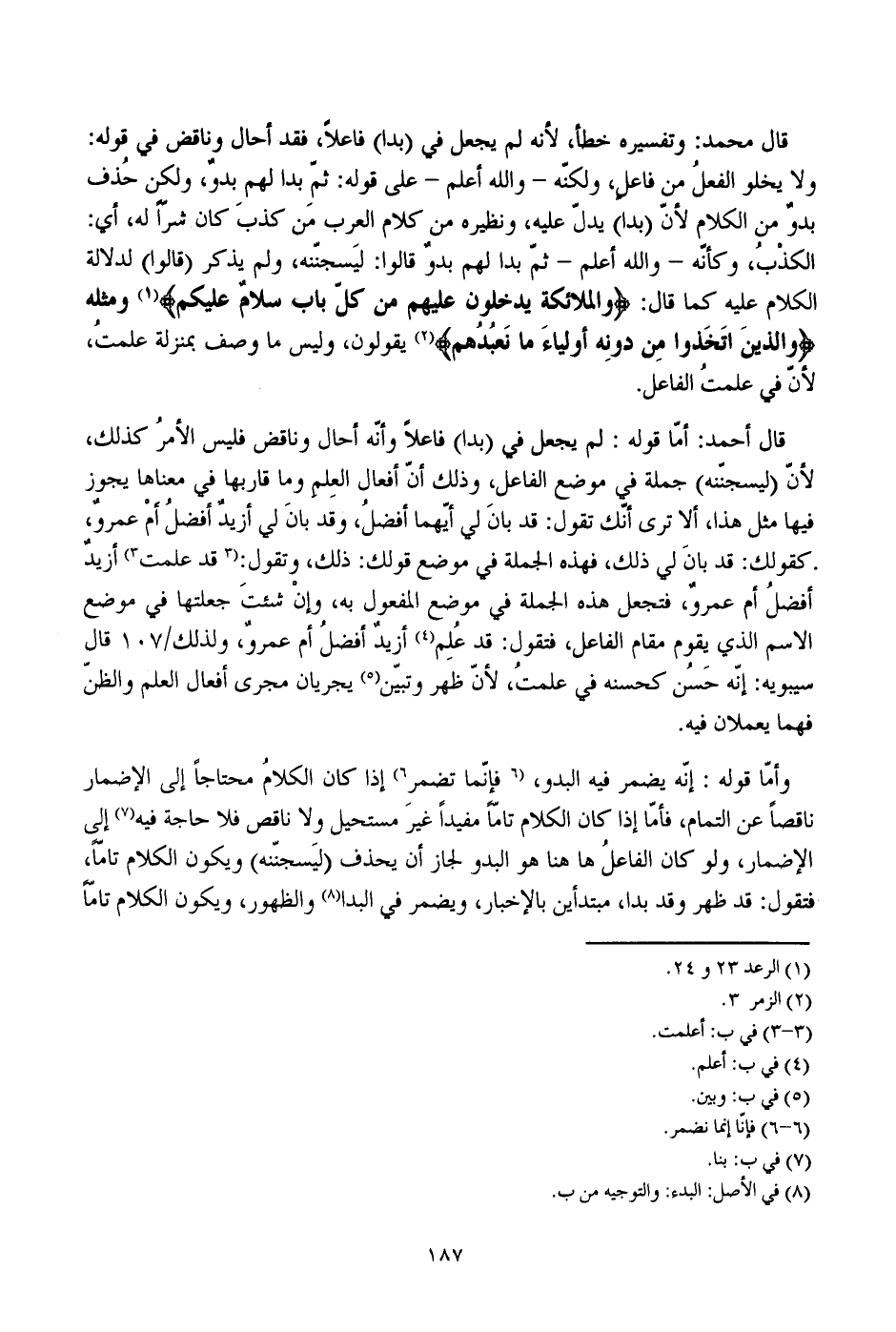 قال محمد: وتفسيره خطأ، لأنه لم يجعل في (بدا) فاعلا، فقد أحال وناقض في قوله: ولا يخلو الفعل من فاعل، ولكنه- والله أعلم- على قوله: ثم بدا لهم بدو، ولكن حذف بدو من الكلام لأن (بدا) يدل عليه، ونظيره من كلام العرب من كذب كان شرا له، أي: الكذب، وكأنه- والله أعلم- ثم بدا لهم بدو قالوا: ليسجننه ولم يذكر (قالوا) لدلالة الكلام عليه كما قال: {والملائكة يدخلون عليهم من كل باب سلام عليكم} ومثله {والذين اتخذوا من دوله أولياء ما نعبدهم} يقولون، وليس ما وصف بمنزلة عملت، لأن في عملت الفاعل.