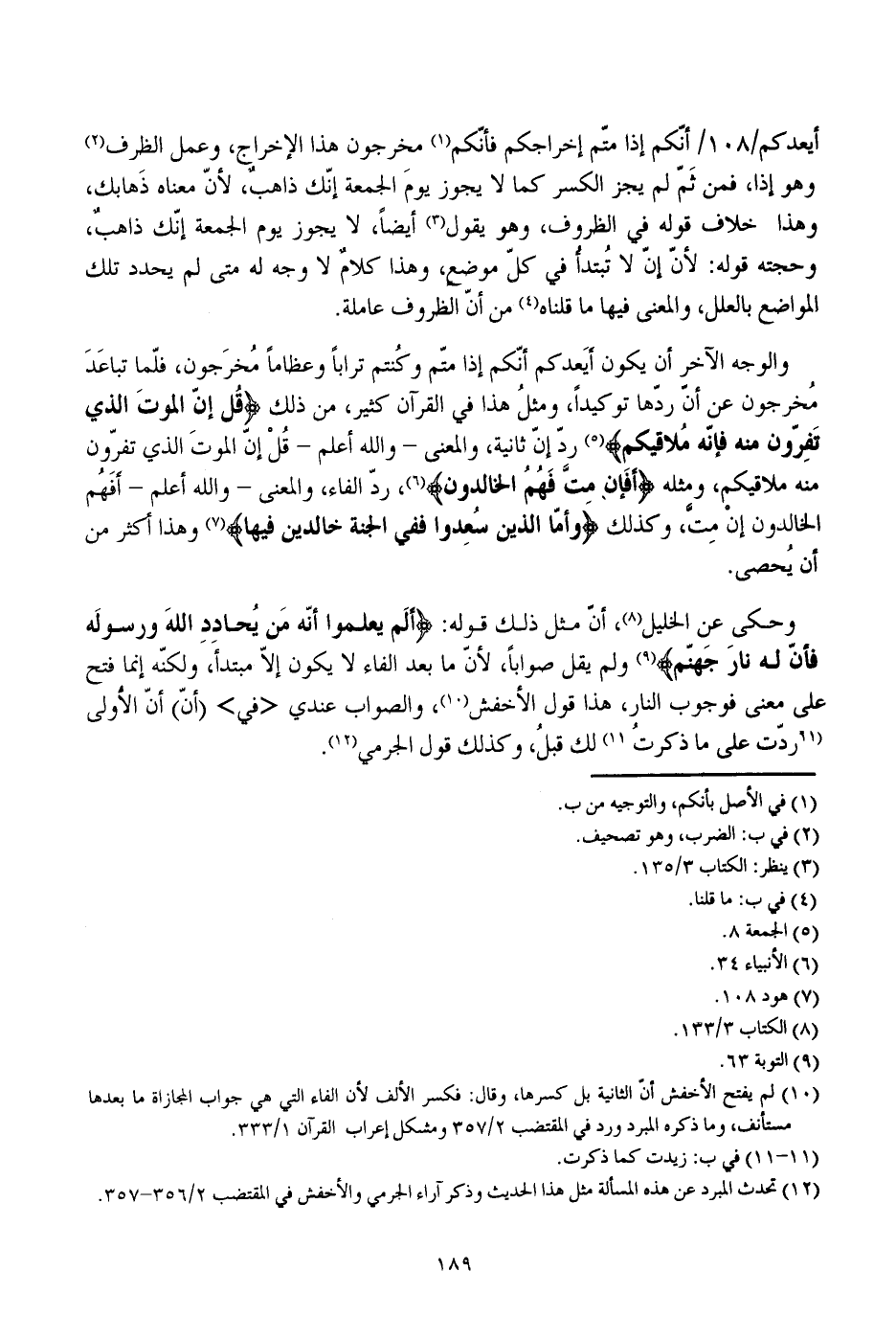 أيعدكم /108/ أنكم إذا متم إخراجكم فأنكم مخرجون هذا الإخراج، وعمل الظرف وهو إذا، فمن ثم لم يجز الكسر كما لا يجوز يوم الجمعة إنك ذاهب، لأن معناه ذهابك، وهذا خلاف قوله في الظروف، وهو يقول أيضا، لا يجوز يوم الجمعة إنك ذاهب، وحجته قوله: لأن إن لا تبتدأ في كل موضع، وهذا كلام لا وجه له متى لم يحدد تلك المواضع بالعلل، والمعنى فيها ما قلناه من أن الظروف عاملة.