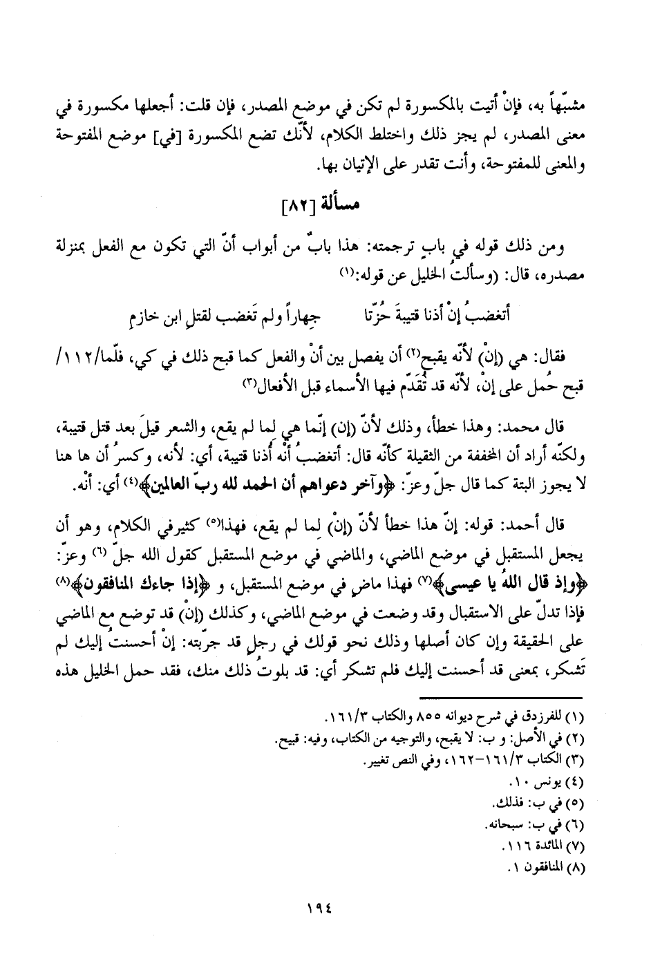 قال محمد: وهذا خطأ، وذلك لأن (إن) إنما هي لما لم يقع، والشعر قيل بعد قتل قتيبة، ولكنه أراد أن المخففة من الثقيلة كأنه قال: أتغضب أنه أذنا قتيبة، أي: لأنه، وكسر أن ها هنا لا يجوز البتة كما قال جل وعز: {وآخر دعواهم أن الحمد لله رب العالمين} أي: أنه.