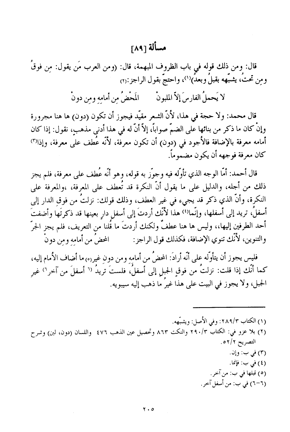 قال محمد: ولا حجة في هذا، لأن الشعر مقيد فيجوز أن تكون (دون) ها هنا مجرورة وإن كان ما ذكر من بنائها على الضم صوابا، إلا أن له في هذا أدنى مذهب، نقول: إذا كان أمامه معرفة بالإضافة فالأجود في (دون) أن تكون معرفة، لأنه عطف على معرفة، وإذا كان معرفة فوجهه أن يكون مضموما.