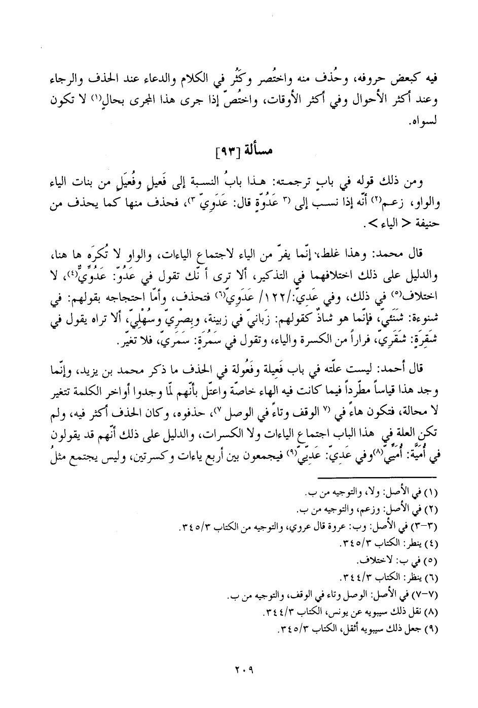 ومن ذلك قوله في باب ترجمته: هذا باب النسبة إلى فعيل وفعيل من بنات الياء والوا، زعم أنه إذا نسب إلي عدوة قال: عدوي، فحذف منها كما يحذف من حنيفة "الياء".