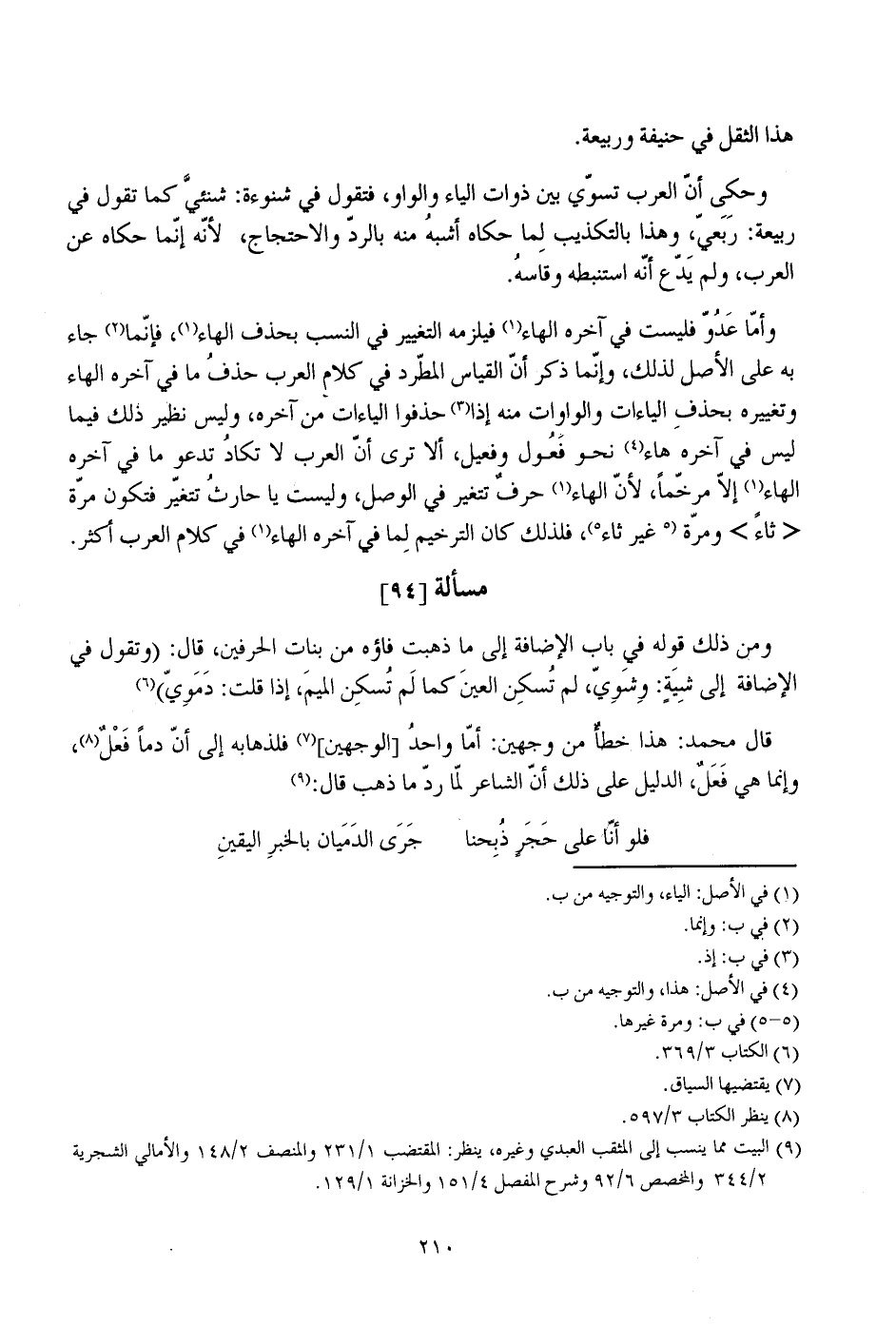 وحكى أن العرب تسوي بين ذوات الياء والواو، فتقول في شنوءة: شنئي كما تقول في ربيعة: ربعي، وهذا بالتكذيب لما حكاه أشبه منه بالرد والاحتجاج، لأنه إنما حكاه عن العرب، ولم يدع أنه استنبطه وقاسه.
