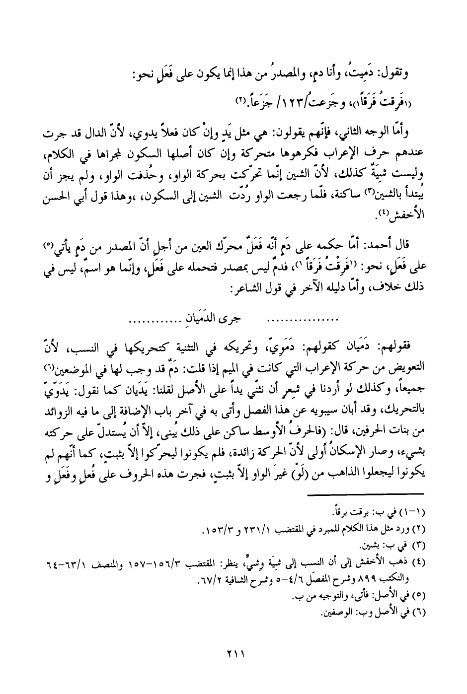 قال أحمد: أما حكمه على دم أنه فعل محرك العين من أحل أن المصدر من دم يأتي على فعل، نحو: فرقت فرقا، فدم ليس بمصدر فتحمله على فعل، وإنما هو اسم، ليس في ذلك خلاف، وأما دليله الآخر في قول الشاعر: