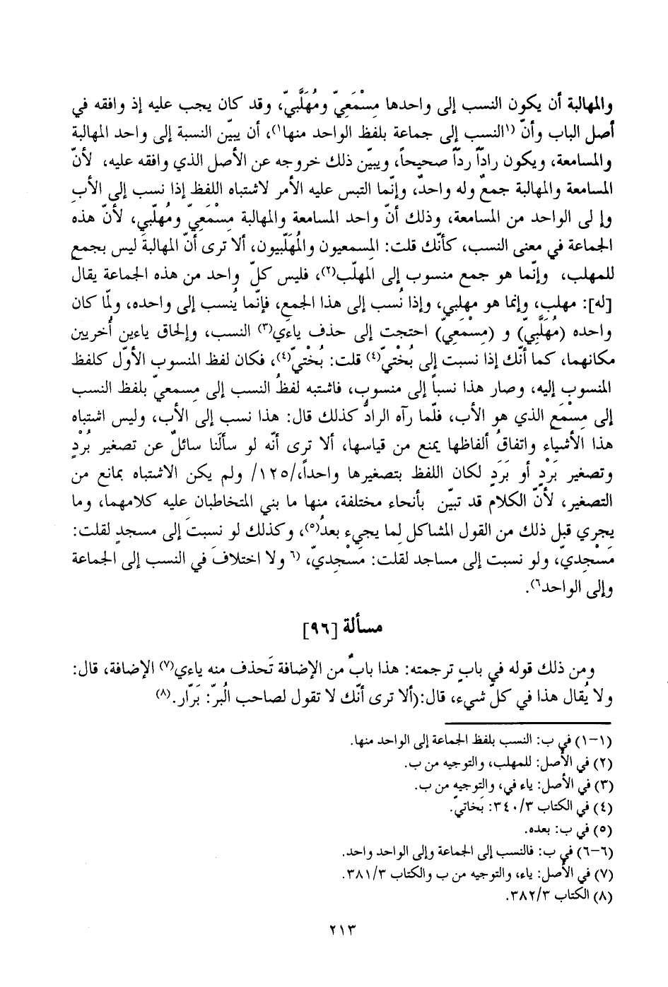 والمهالبة أن يكون النسب إلى واحدها مسمعي ومهلبي، وقد كان يجب عليه إذ وافقه في أصل الباب وأن النسب إلى جماعة بلفظ الواحد منها، أن يبين النسبة إلى واحد المهالبة والمسامعة، ويكون رادا ردا صحيحا، ويبين ذلك خروجه عن الأصل الذي وافقه عليه، لأن المسامعة والمهالبة جمع وله واحد، وإنما التبس عليه الأمر لاشتباه اللفظ إذا نسب إلى الأب وإلى الواحد من المسامعة، وذلك أن واحد المسامعة والمهالبة مسمعي ومهلبي، لأن هذه الجماعة في معنى النسب، كأنك قلت: المسمعيون والمهلبيون، ألا ترى أن المهالبة ليس بجمع للمهلب، وإنما هو جمع منسوب إلى المهلب، فليس كل واحد من هذه الجماعة يقال [له]: مهلب، وإنما هو مهلبي، وإذا نسب إلى هذا الجمع، فإنما ينسب إلى واحده، ولما كان واحده (مهلبي) و (مسمعي) احتجت إلى حذف ياءي النسب، وإلحاق ياءين أخريين مكانهما، كما أنك إذا نسبت إلى بختي قلت: بختي، فكان لفظ المنسوب الأول كلفظ المنسوب إليه، وصار هذا نسبا إلى منسوب، فاشتبه لفظ النسب إلى مسمعي بلفظ النسب إلى مسمع الذي هو الأب، فلما رآه الراد كذلك قال: هذا نسب إلى الأب، وليس اشتباه هذا الأشياء واتفاق ألفاظها يمنع من قياسها، ألا ترى أنه لو سألنا سائل عن تصغير برد وتصغير برد أو برد لكان اللفظ بتصغيرها واحدا، /125/ ولم يكن الاشتباه بمانع من التصغير، لأن الكلام قد تبين بأنحاء مختلفة، منها ما بني المتخاطبان عليه كلامهما، وما يجري قبل ذلك من القول المشاكل لما يجيء بعد، وكذلك لو نسبت إلى مسجد لقلت: مسجدي، ولو نسبت إلى مساجد لقلت: مسجدي، ولا اختلاف في النسب إلى الجماعة وإلى الواحد.