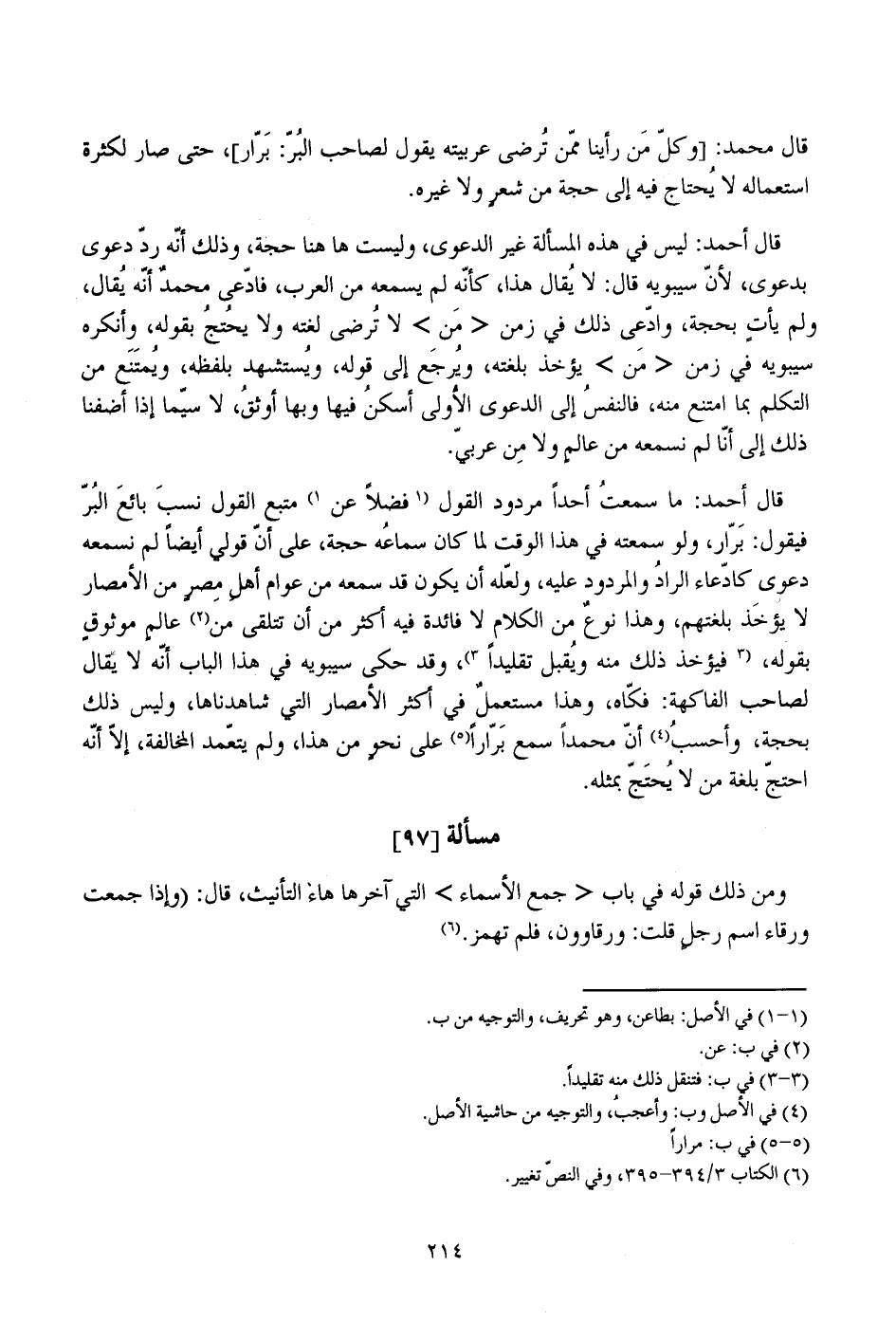 قال أحمد: ما سمعت أحدا مردود القول فضلا عن متبع القول نسب بائع البر فيقول: برار، ولو سمعته في هذا الوقت لما كان سماعه حجة، على أن قولي أيضا لم نسمعه دعوى كادعاء الراد والمردود عليه، ولعله أن يكون قد سمعه من عوام أهل مصر من الأمصار لا يؤخذ بلغتهم، وهذا نوع من الكلام لا فائدة فيه أكثر من أن تتلقى من عالم موثوق بقوله، فيؤخذ ذلك منه ويقبل تقليدا، وقد حكى سيبويه في هذا الباب أنه لا يقال لصاحب الفاكهة: فكاه، وهذا مستعمل في أكثر الأمصار التي شاهدناها، وليس ذلك بحجة، وأحسب أن محمدا سمع برارا على نحو من هذا، ولم يتعمد المخالفة، إلا أنه احتج بلغة من لا يحتج بمثله.