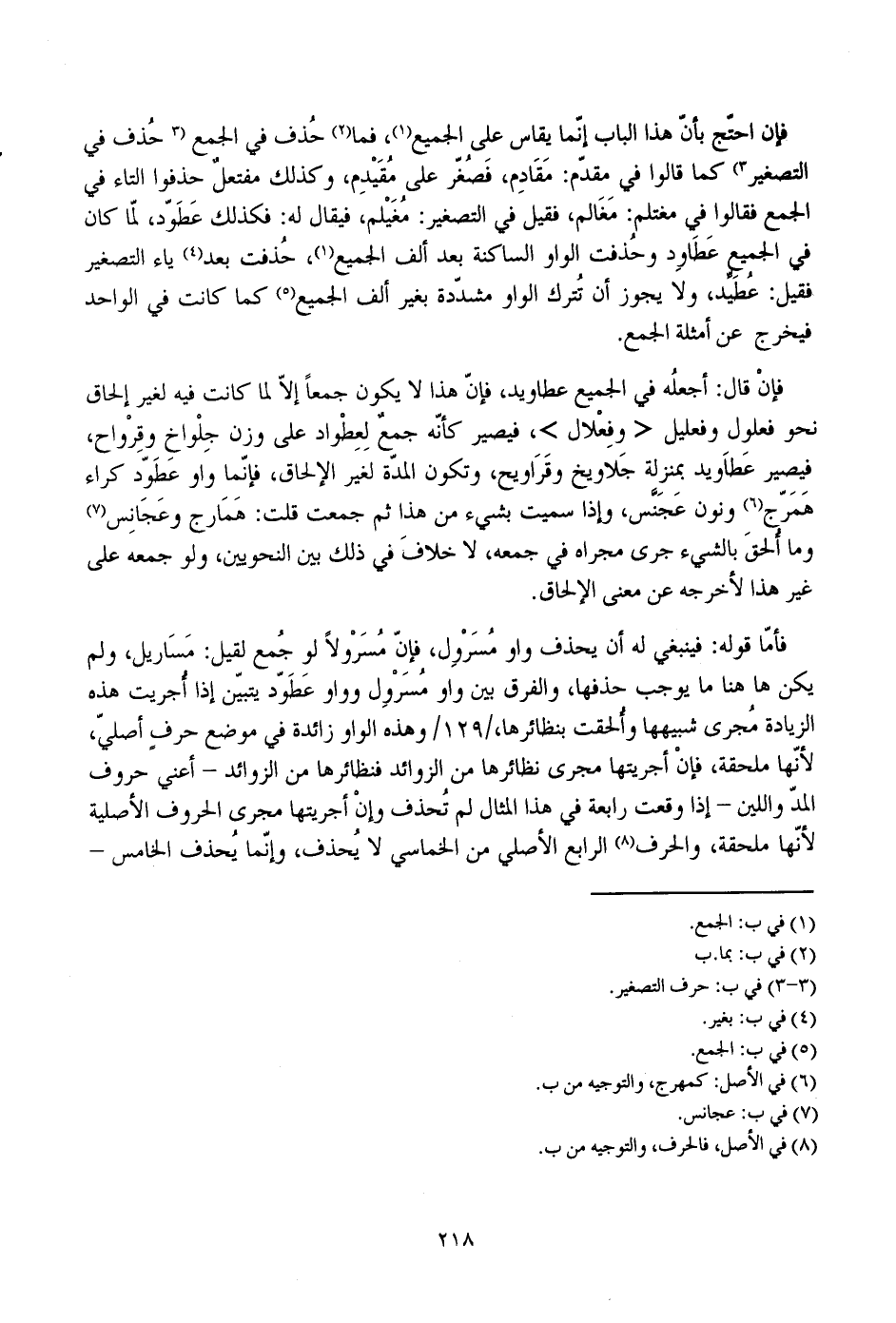 فأما قوله: فينبغي له أن يحذف واو مسرول، فإن مسرولا لو جمع لقيل: مساريل، ولم يكن ها هنا ما يوجب حذفها، والفرق بين واو مسرول وواو عطود يتبين إذا أجريت هذه الزيادة مجرى شبيهها وألحقت بنظائرها، /129/ وهذه الواو زائدة في موضع حرف أصلي، لأنها ملحقة، فإن أجريتها مجرى نظائرها من الزوائد فنظائرها من الزوائد- أعني حروف المد واللين- إذا وقعت رابعة في هذا المثال لم تحذف وإن أجريتها مجرى الحروف الأصلية لأنها ملحقة، والحرف الرابع الأصلي من الخماسي لا يحذف، وإنما يحذف الخامس-